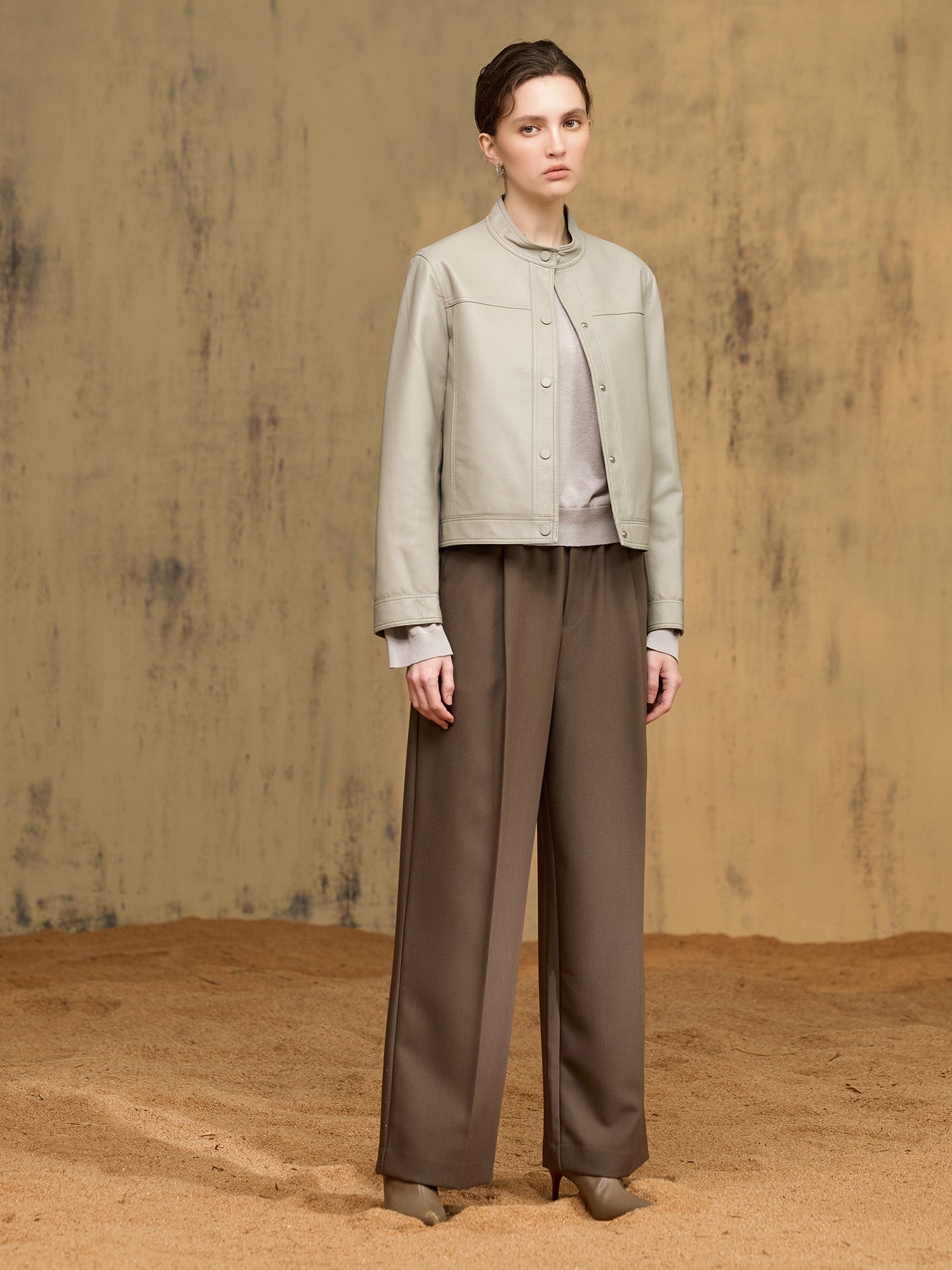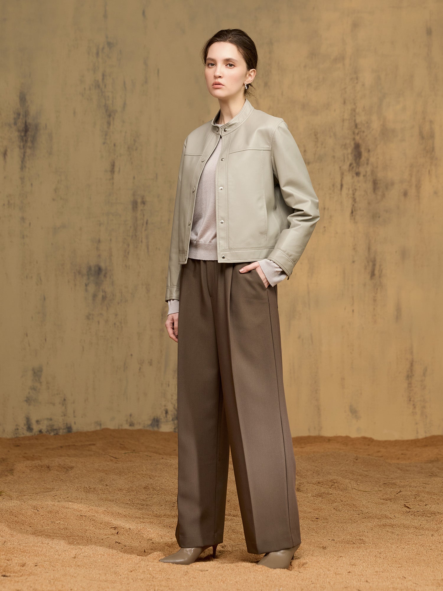 *立領設計搭配排釦門襟,極簡而硬挺,勾勒現代摩登氣質;胸線拼接修飾比例,短版剪裁拉高腰線更顯俐落。