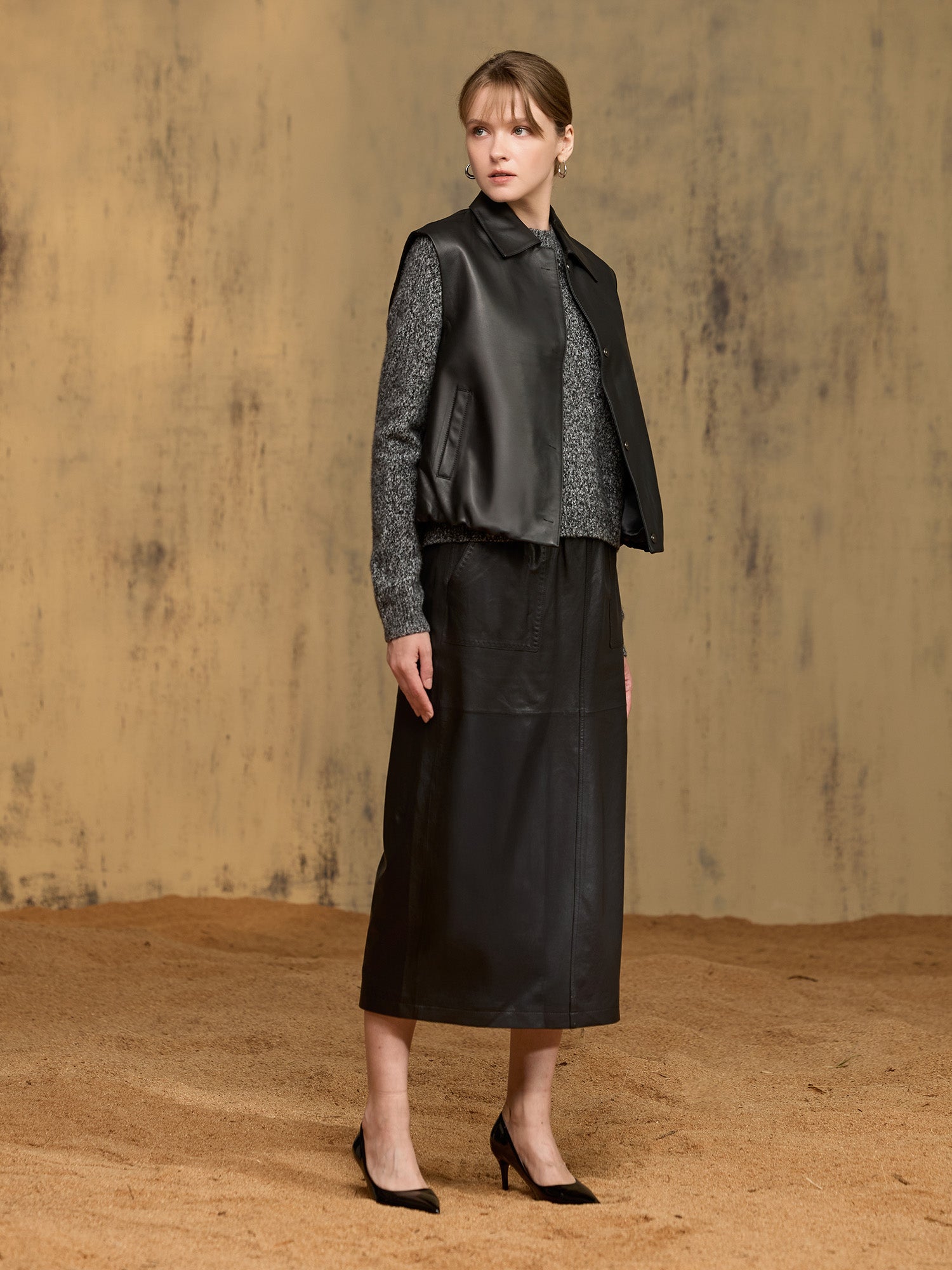 *鉛筆裙剪裁俐落,修飾下身比例;鬆緊腰頭結合抽繩設計,舒適貼合並可依身形調整。兩側外貼大口袋融入休閒元素,平衡皮革的摩登氣息,日常可輕鬆搭配。