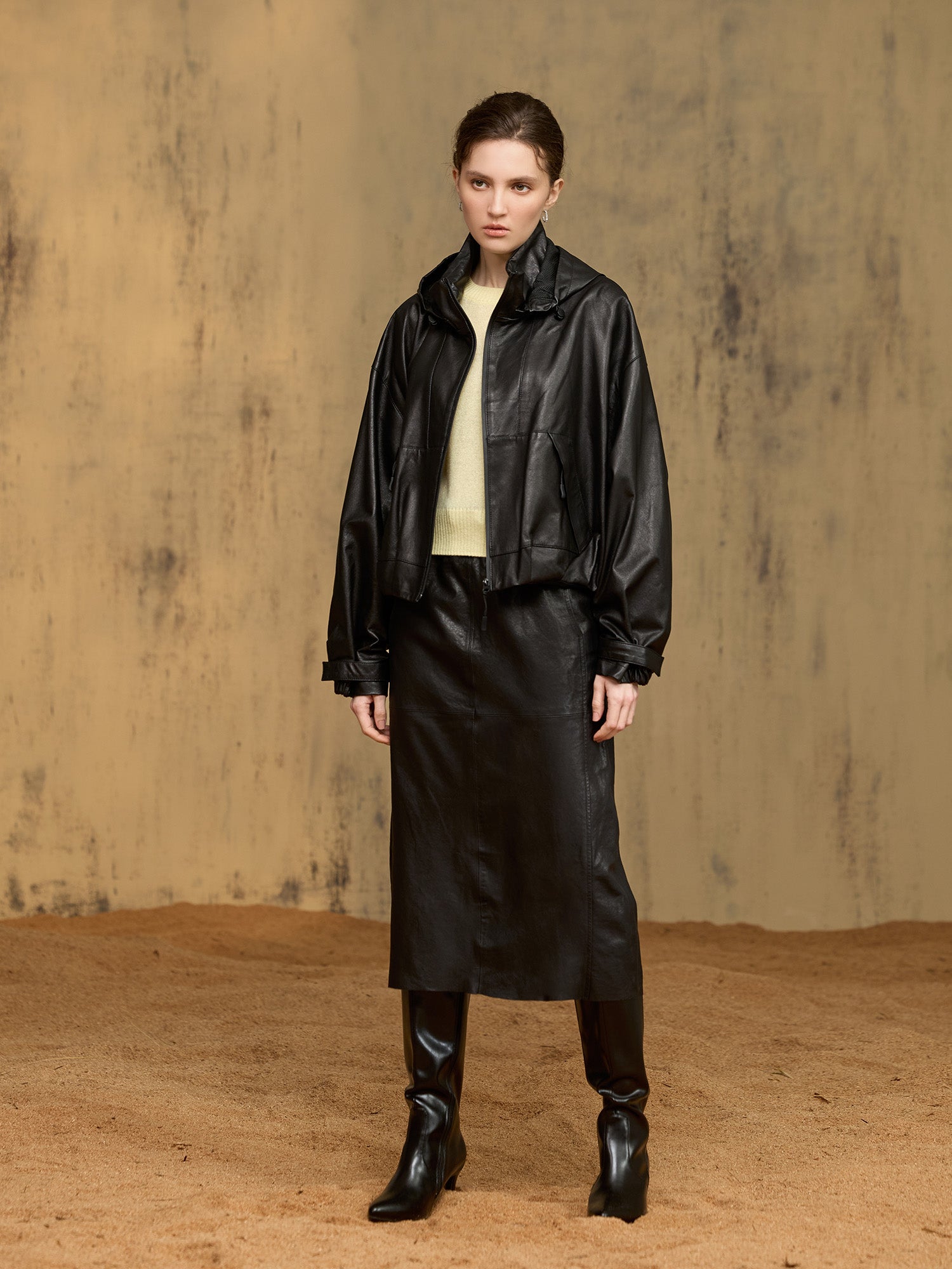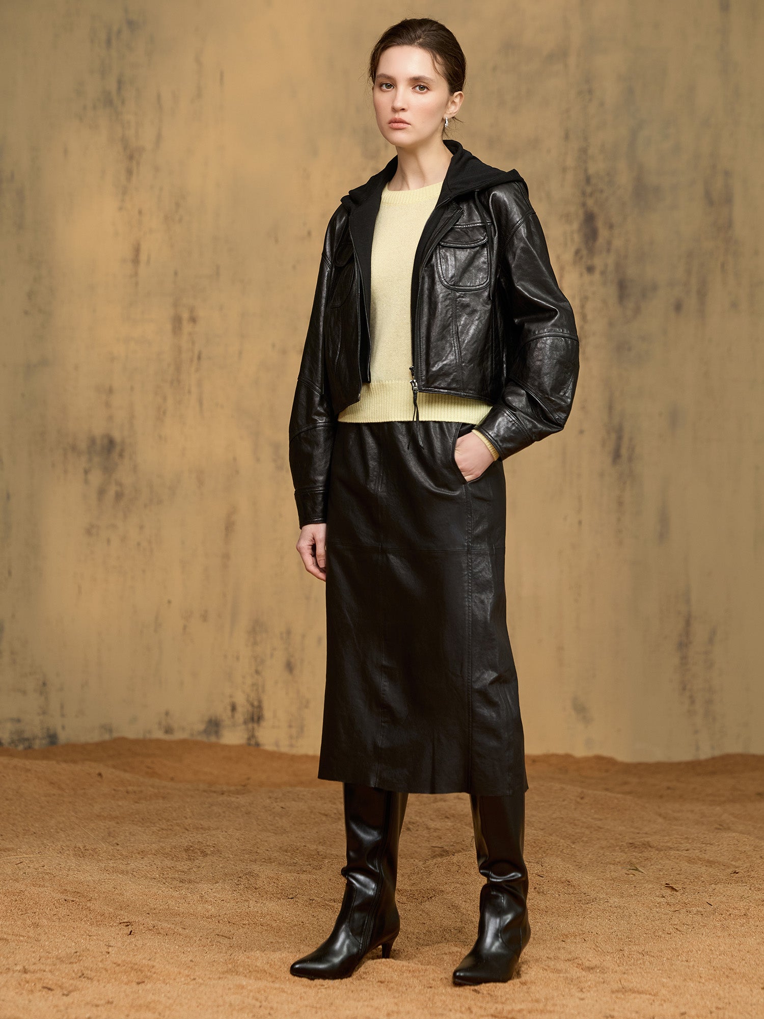*中長裙長度結合微A字廓形,修飾腿部線條,俐落大方;裙身剪裁巧妙延伸結合口袋緣弧線,處理細膩流暢,在優雅與休閒間取得完美平衡。
