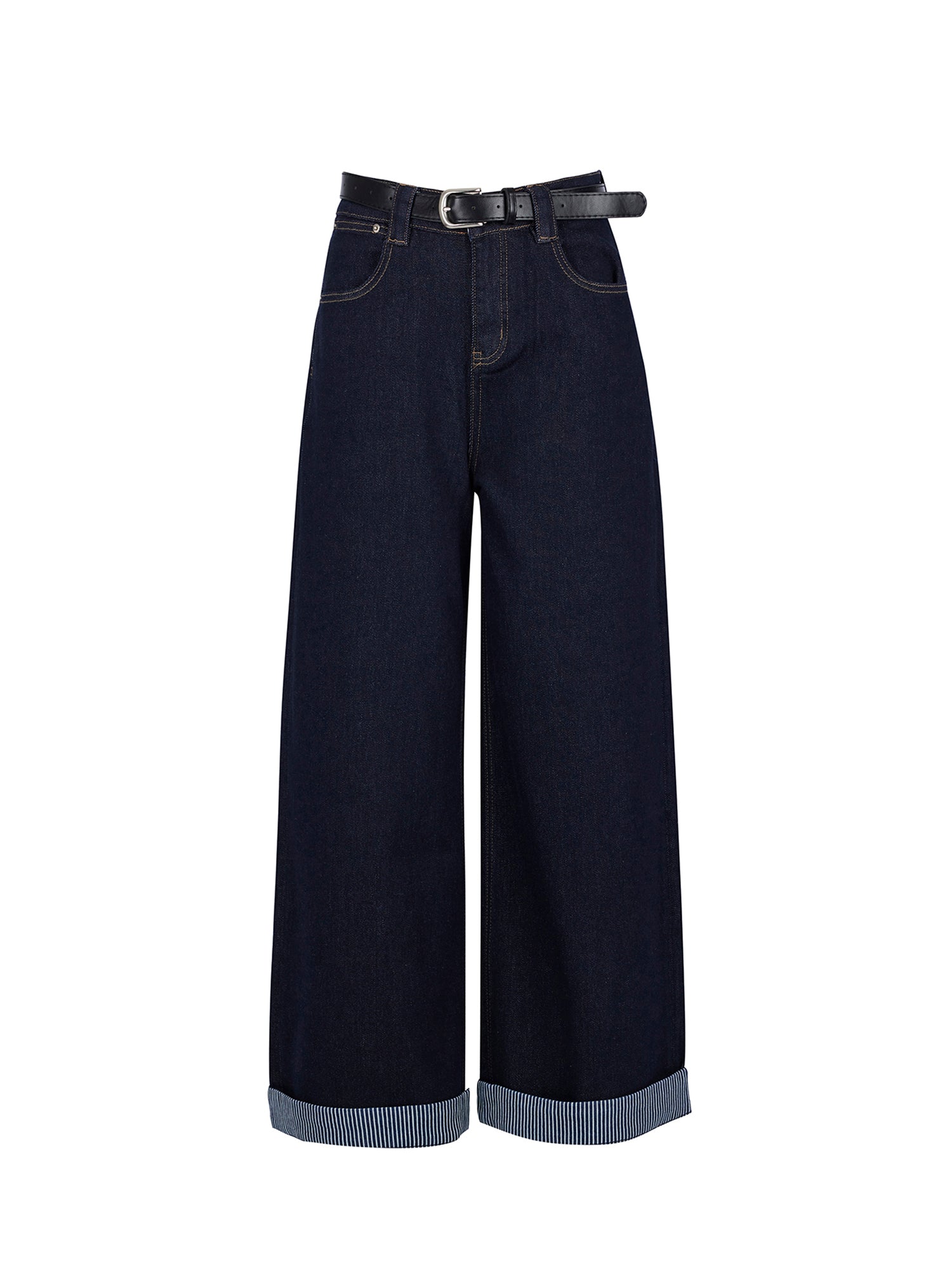 *高腰寬筒反折牛仔褲,穿著舒適度更高,亦可展現俐落垂墜感,行走間自然擺動更顯修長。
