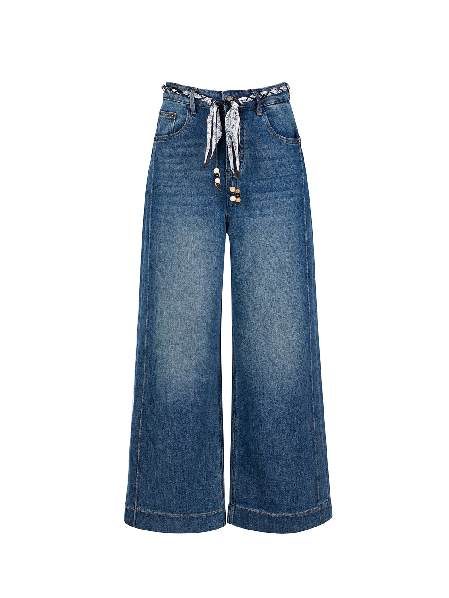 *高腰搭配筆直寬版剪裁,淺刷色與褲身漸層洗感帶來輕鬆質感,腰部以絲巾綁帶取代傳統皮帶,結尾串珠細節增添隨性度假氛圍。