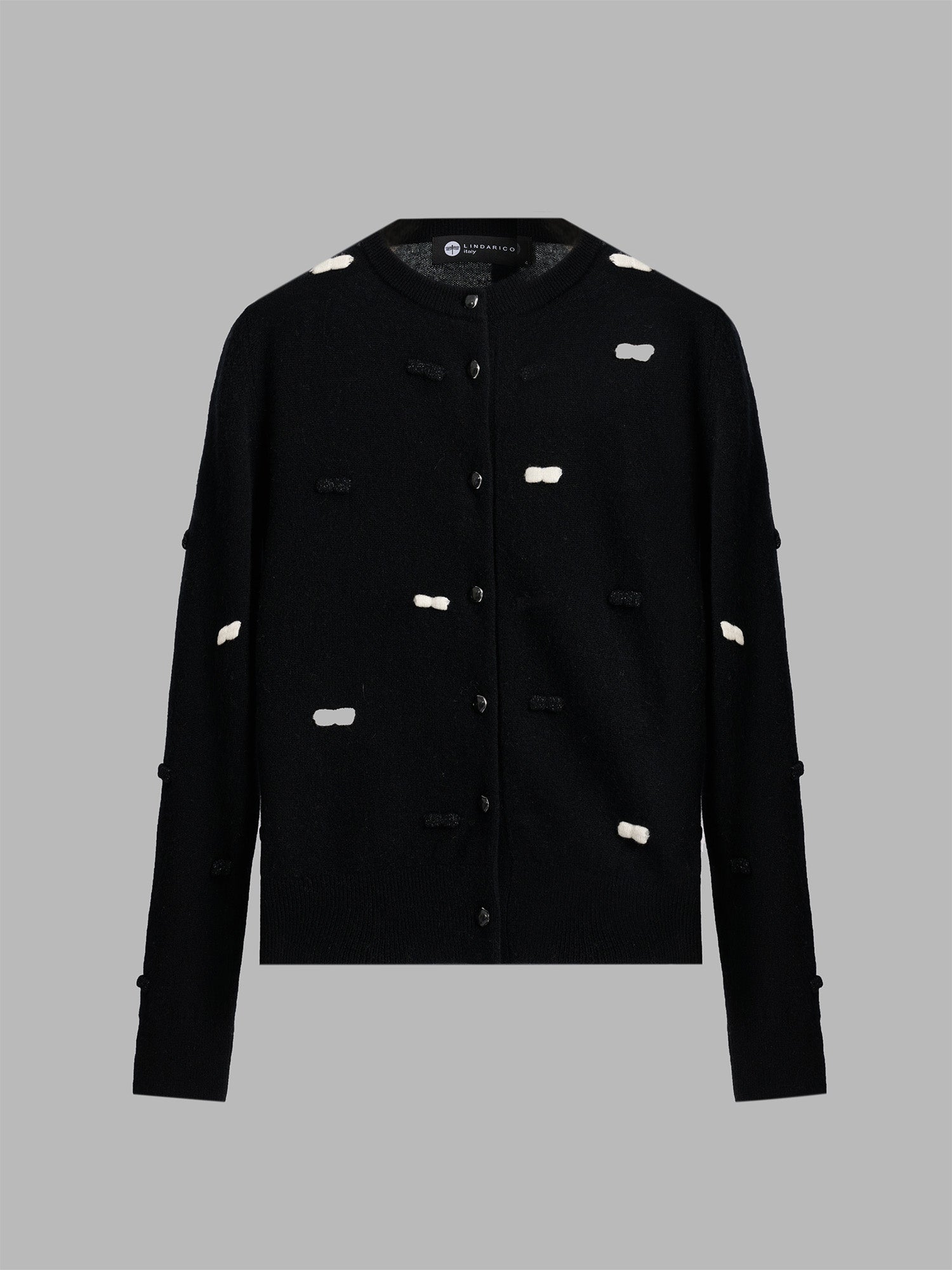 *圓領開襟針織外套,點綴大小均勻的立體織結,錯落分布於衣身與袖片,為簡約款式增添俏麗感。門襟與袖口收邊細緻,修飾整體線條。