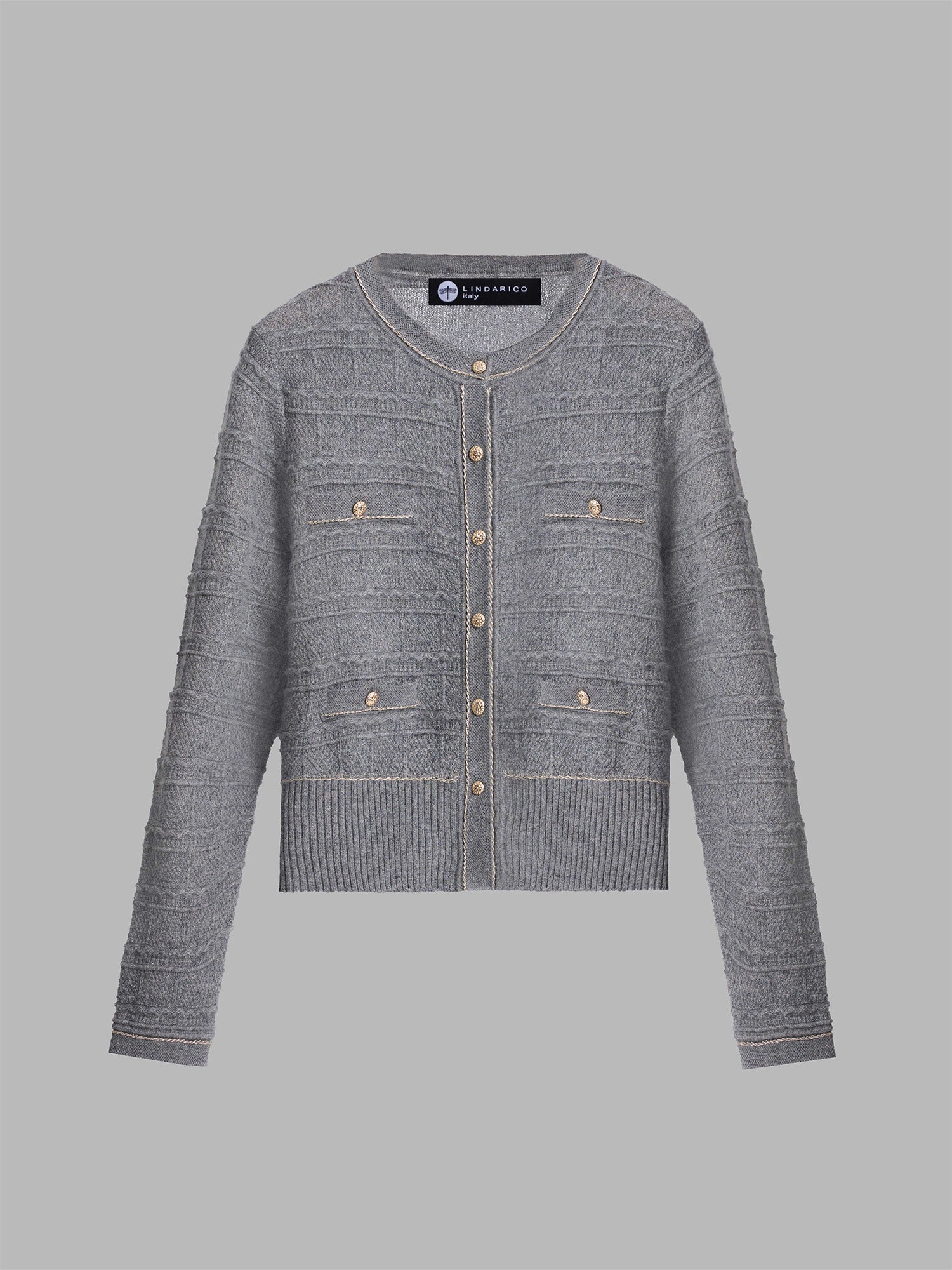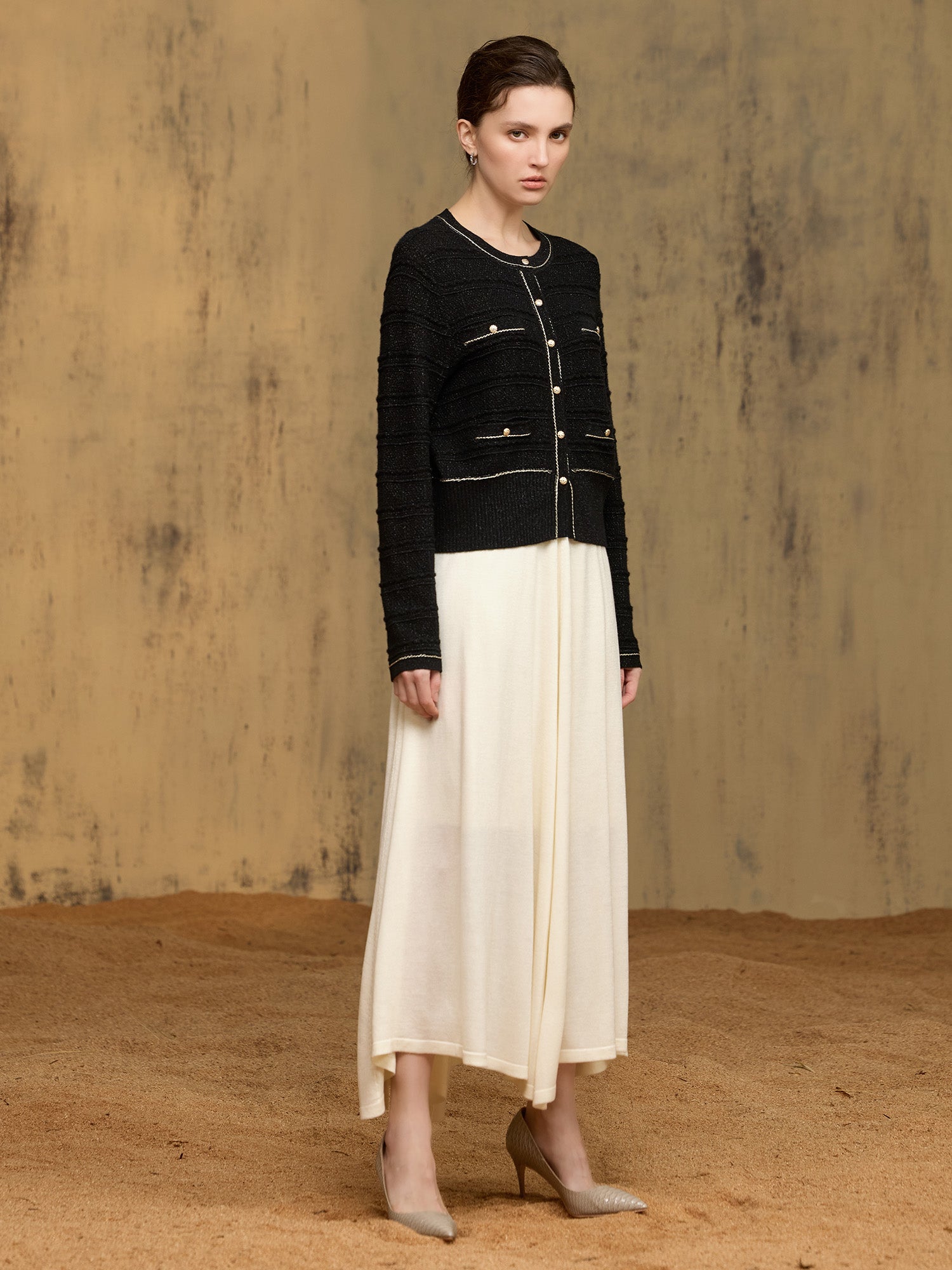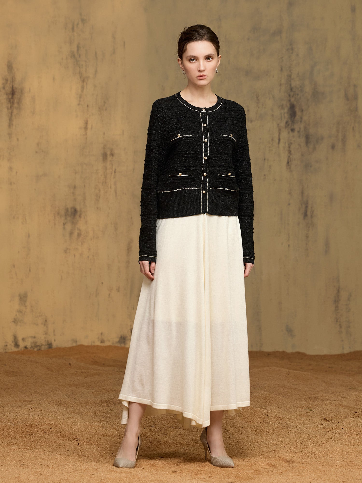 *修身圓領短版針織外套,修飾身形比例;前幅與袖身以橫向織紋結合金線描邊,視覺效果立體,顯細節精緻,散發優雅氣質。
