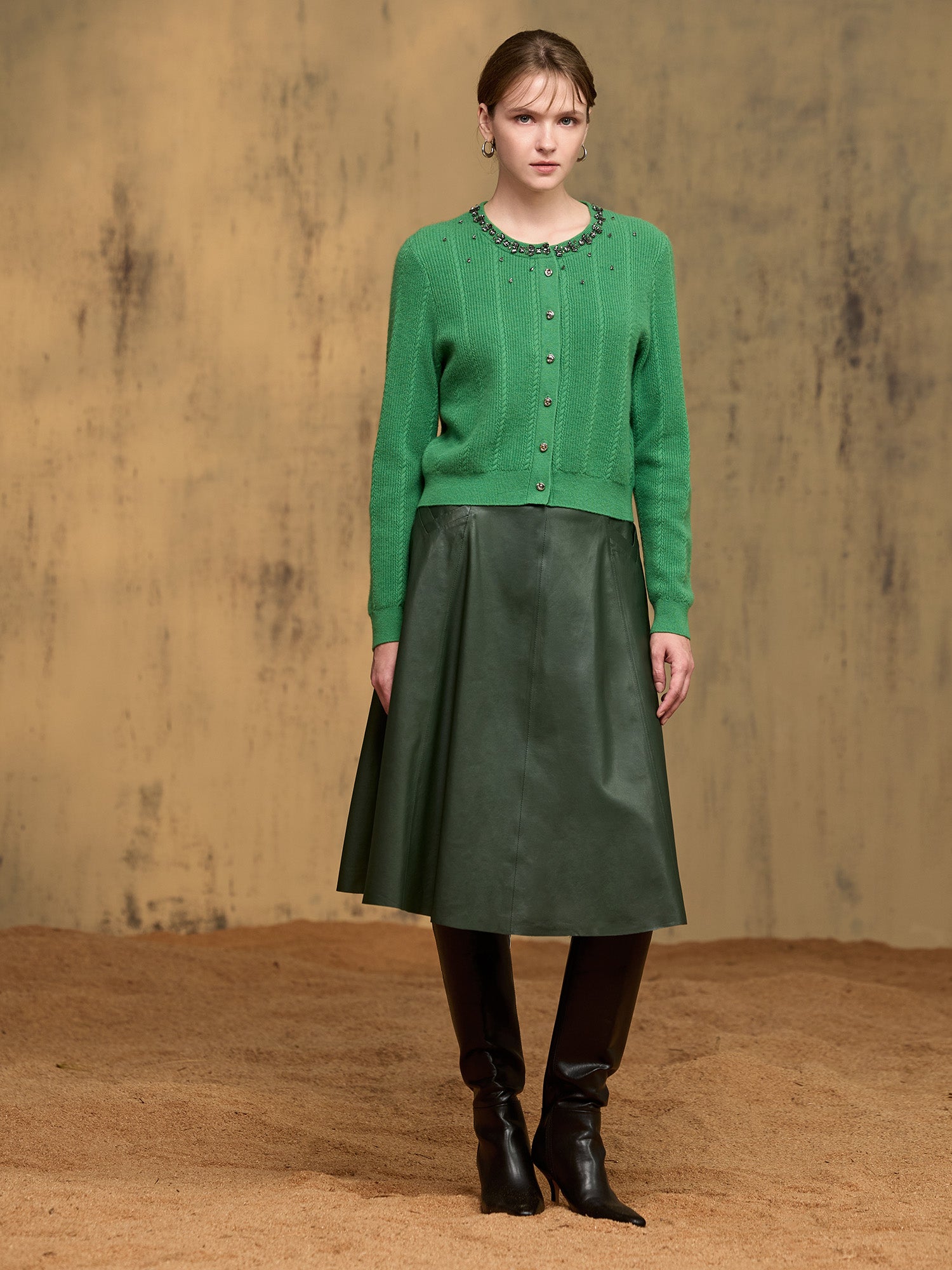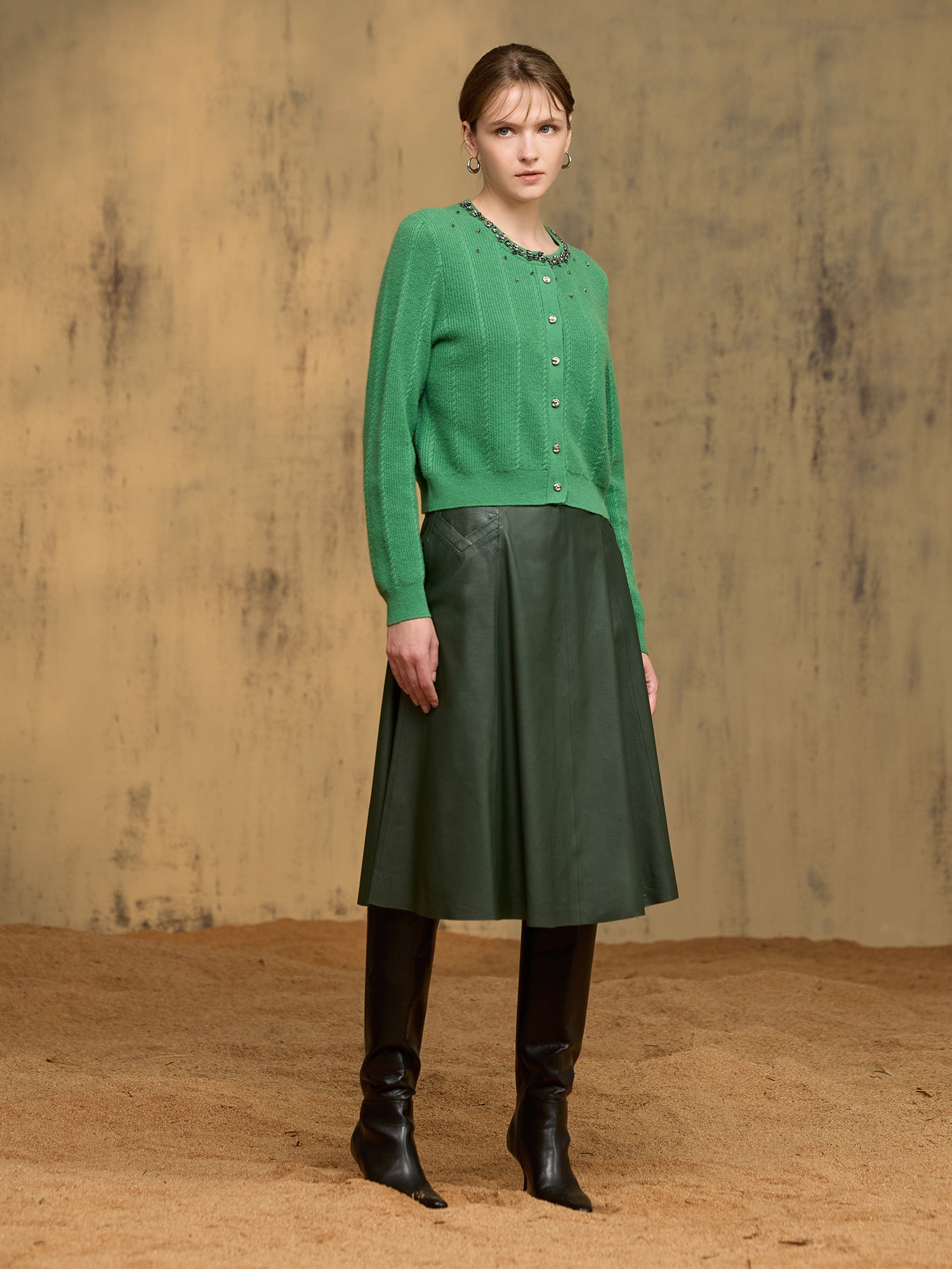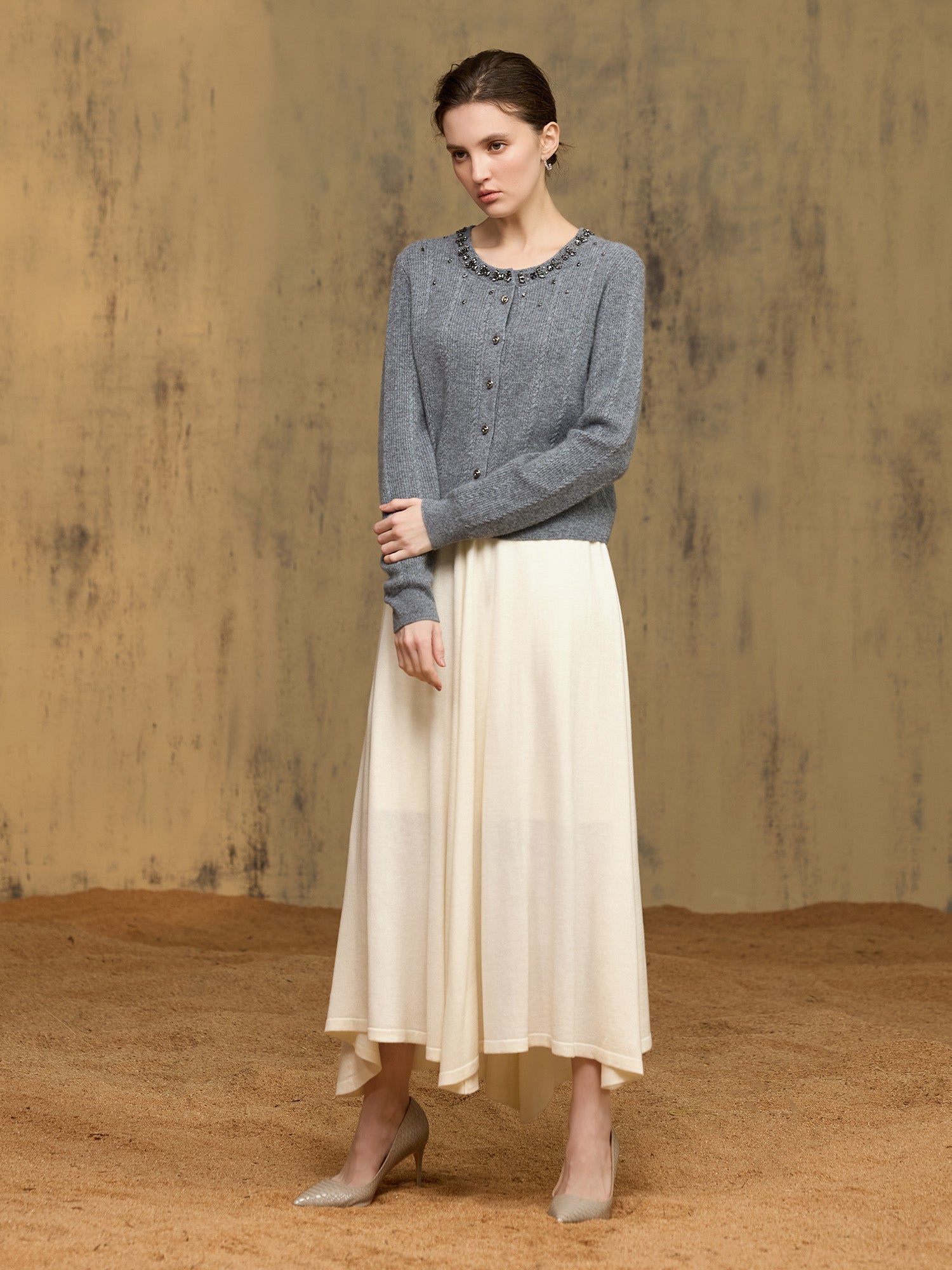 *修身短版針織外套,細緻織紋營造質感層次,領口鑲嵌立體亮鑽點綴,低調華麗中展現精緻品味。