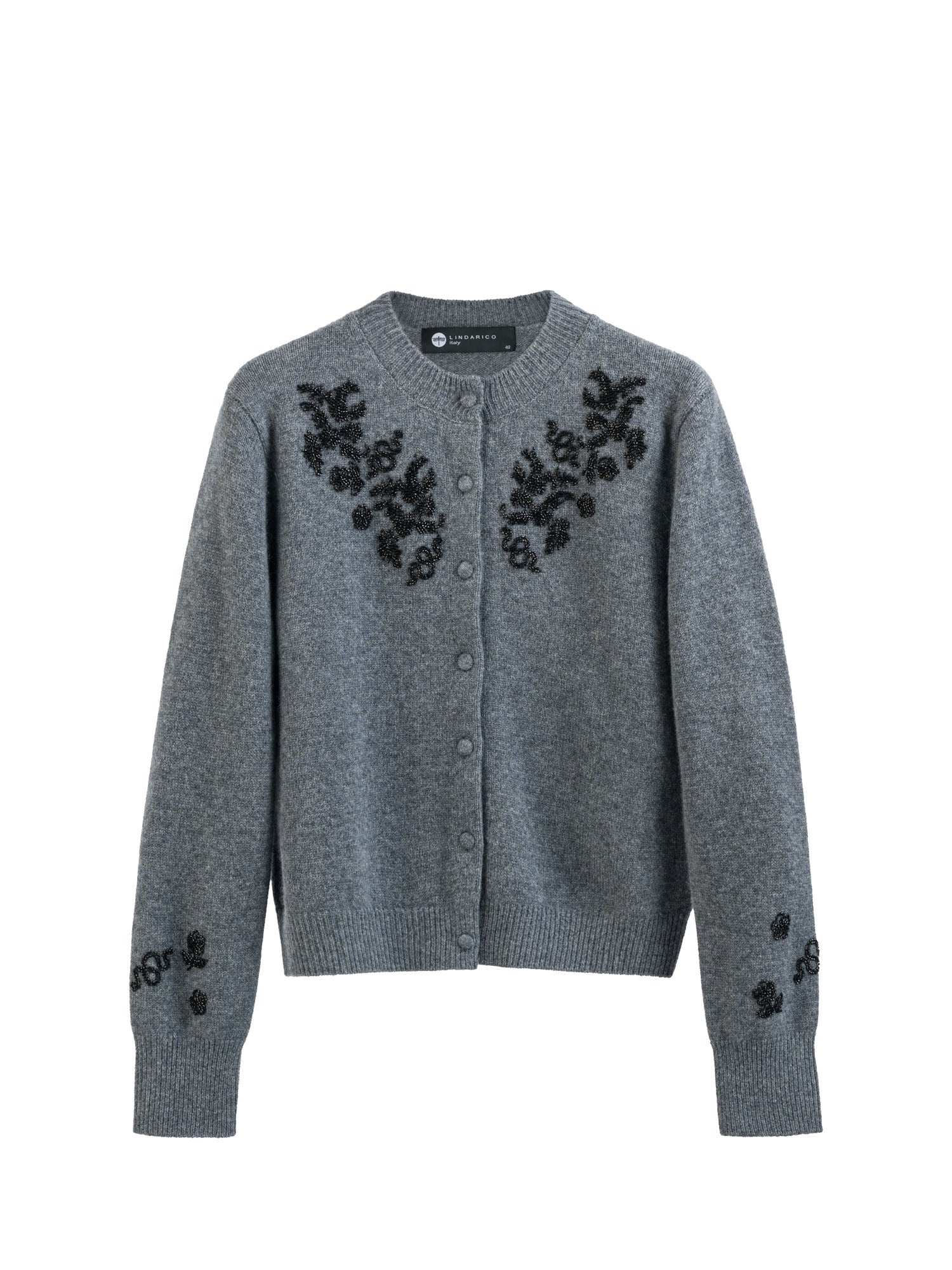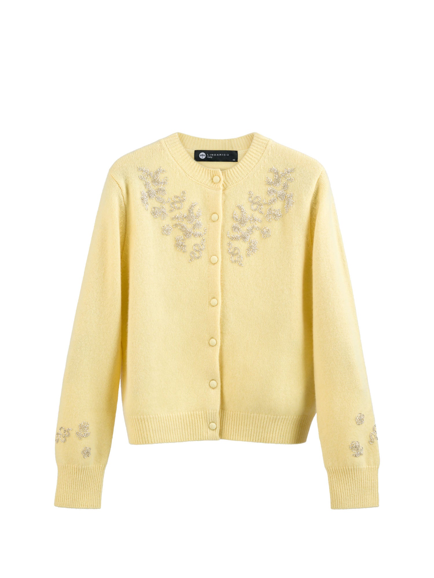 *肩頸與袖口以立體珠繡勾勒花型,細節精緻,襯托柔和光澤。圓領開襟剪裁搭配包布釦,線條乾淨俐落,襯托溫柔魅力。
