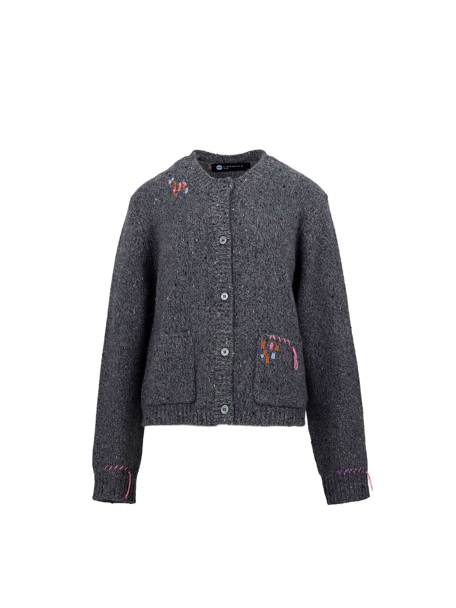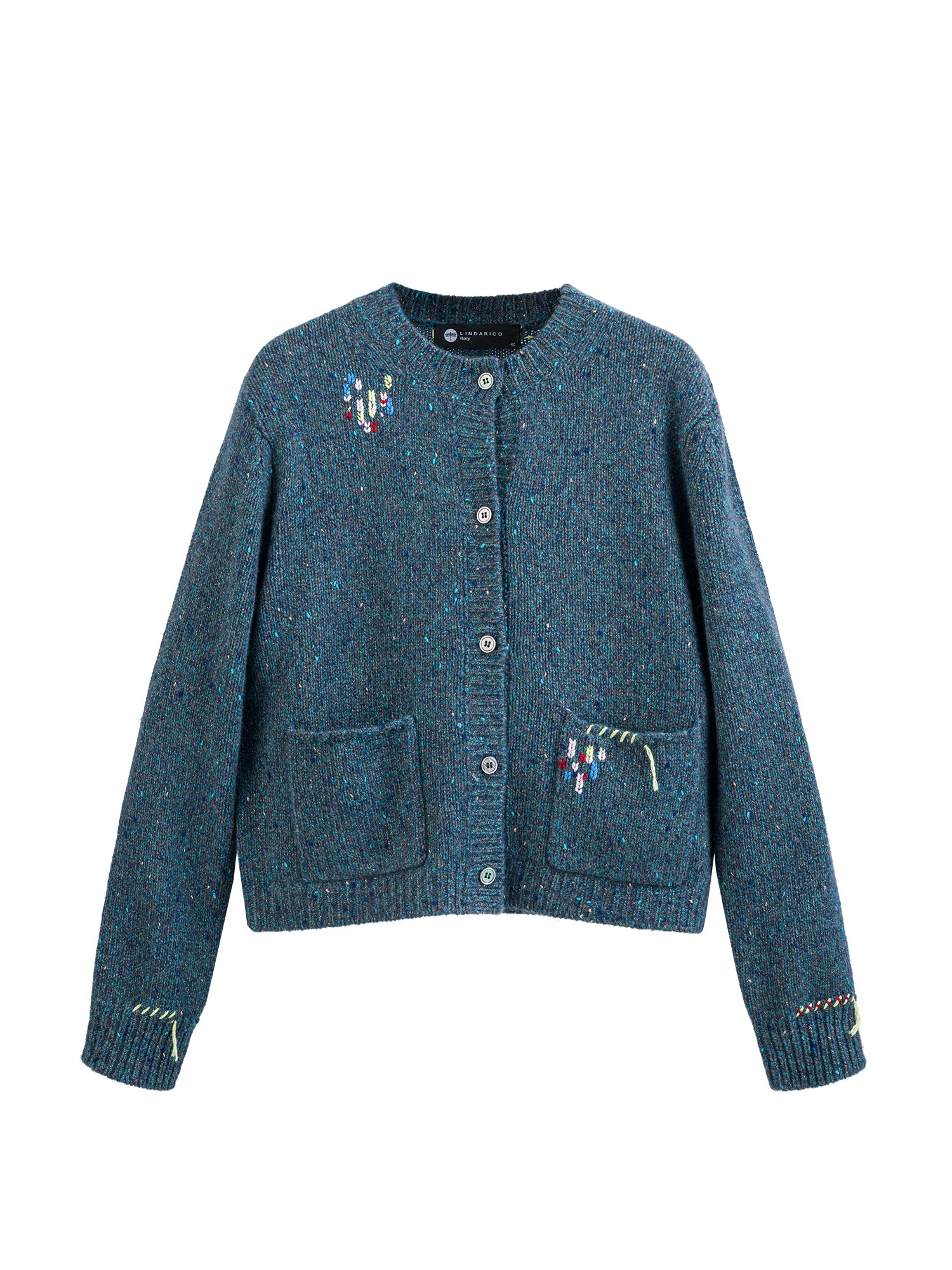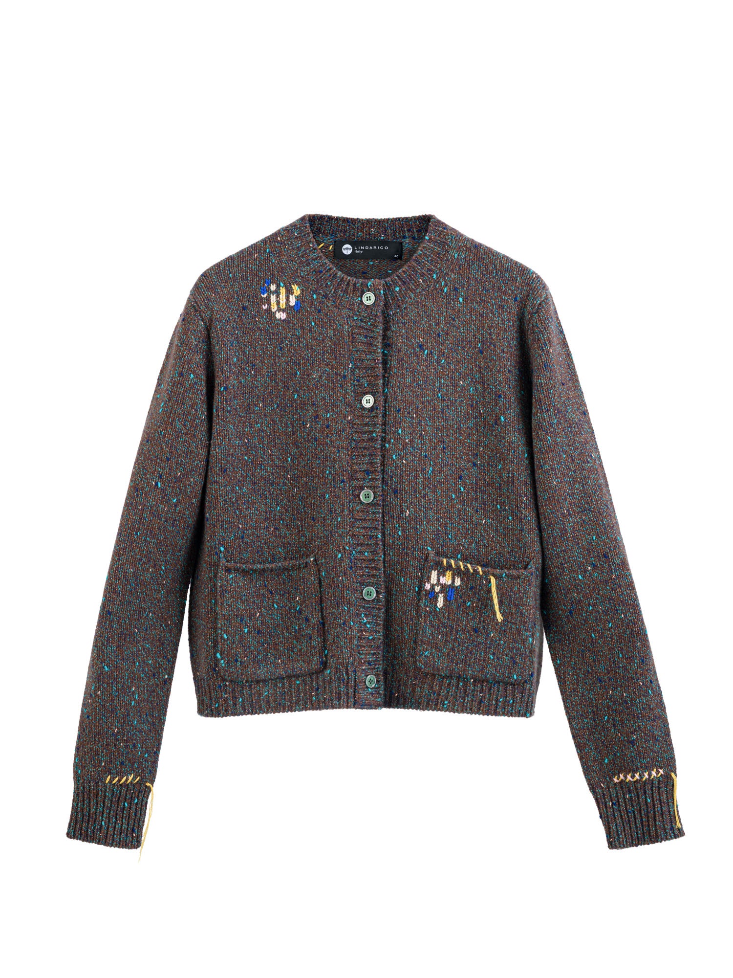 *混色紗線交織出細緻色點紋理,呈現自然立體感。局部點綴手縫感圖案十分活潑,增添年輕氣息。