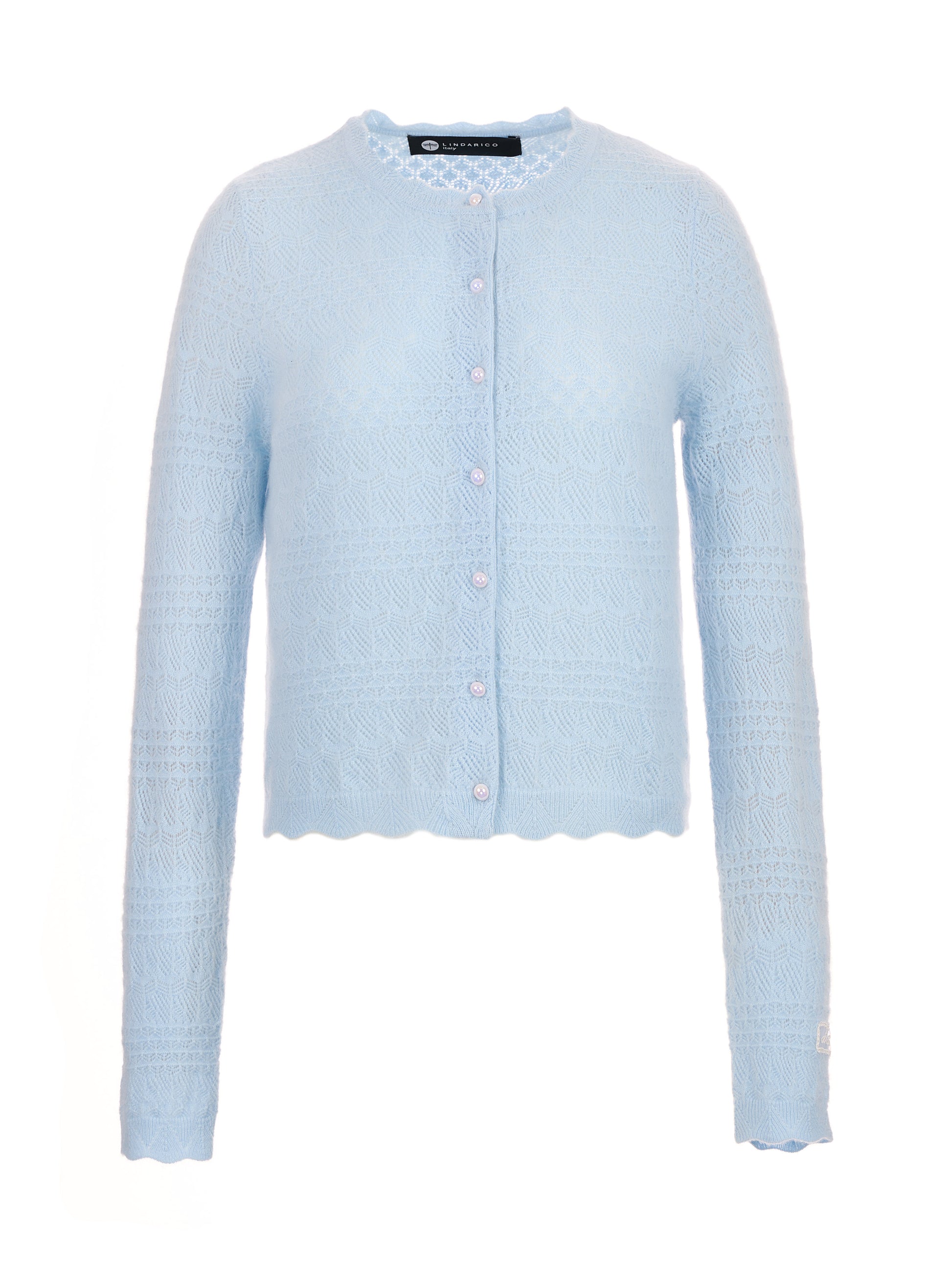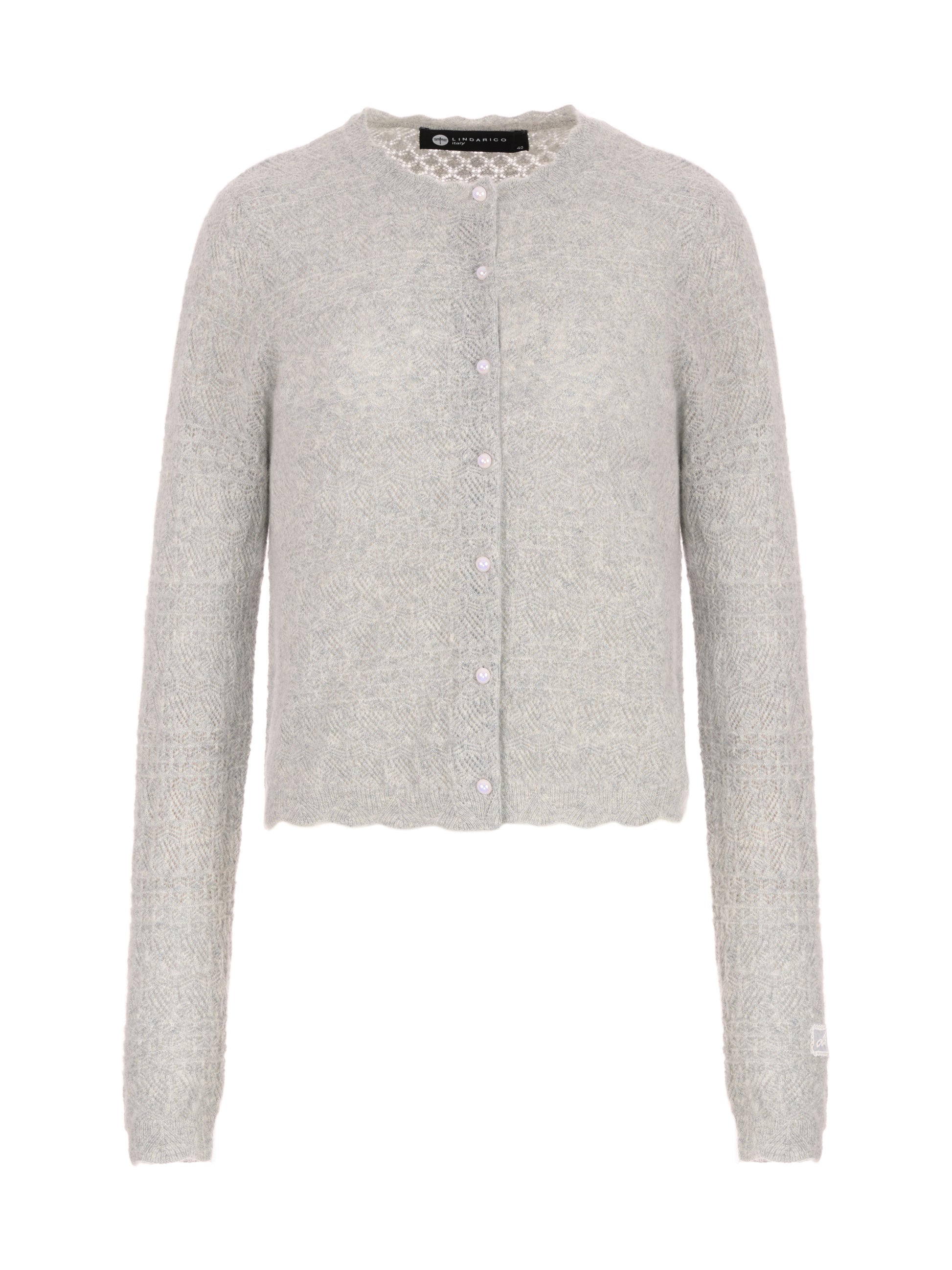 *短版圓領針織外套,袖口蕾絲小標增添品牌識別;全件以細緹花織紋呈現柔和層次,下擺微波浪線條帶出輕巧優雅。門襟採用珍珠釦點綴,營造精緻而柔美的氣質。