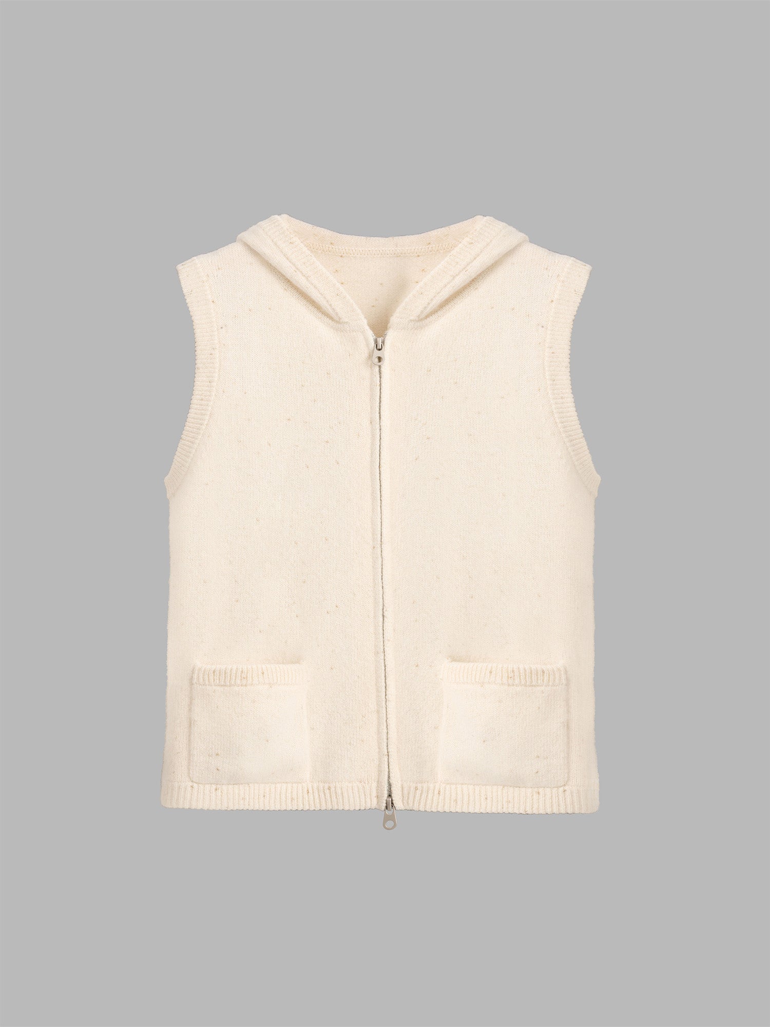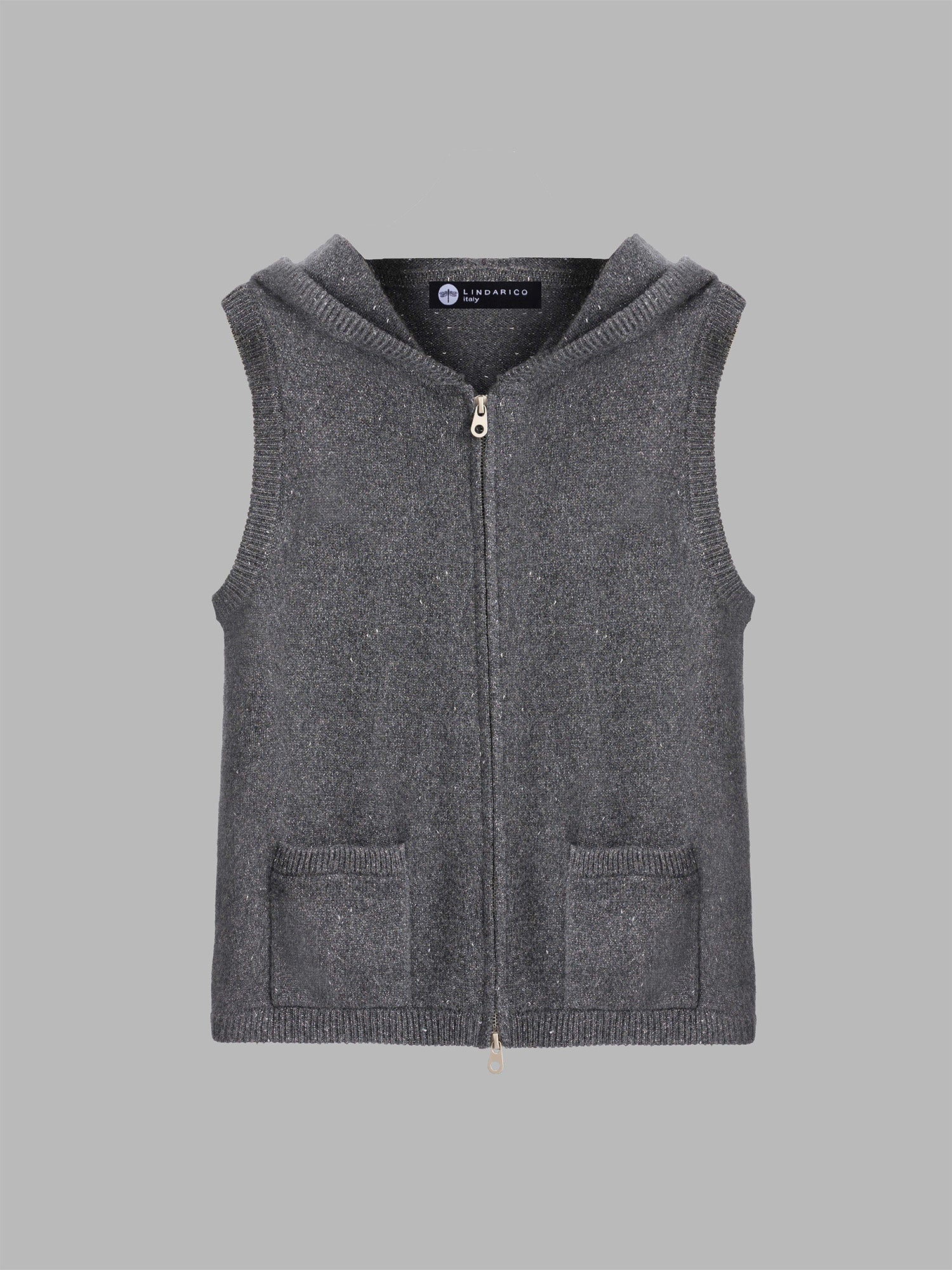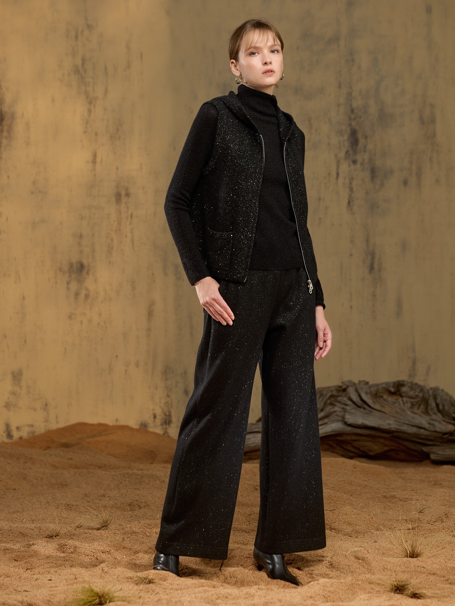 *連帽拉鍊背心,結合實穿與休閒感,增添層次穿搭的變化性。微亮絲質感面料,在低調黑色基底中隱隱閃耀,展現精緻華麗氣息。