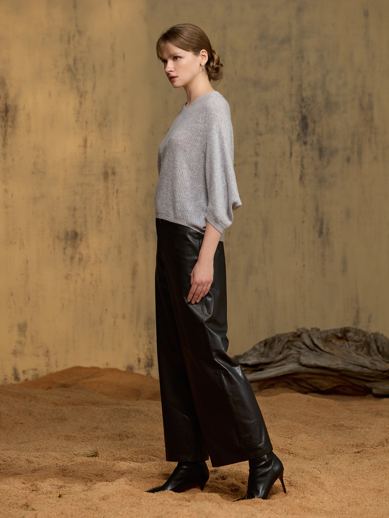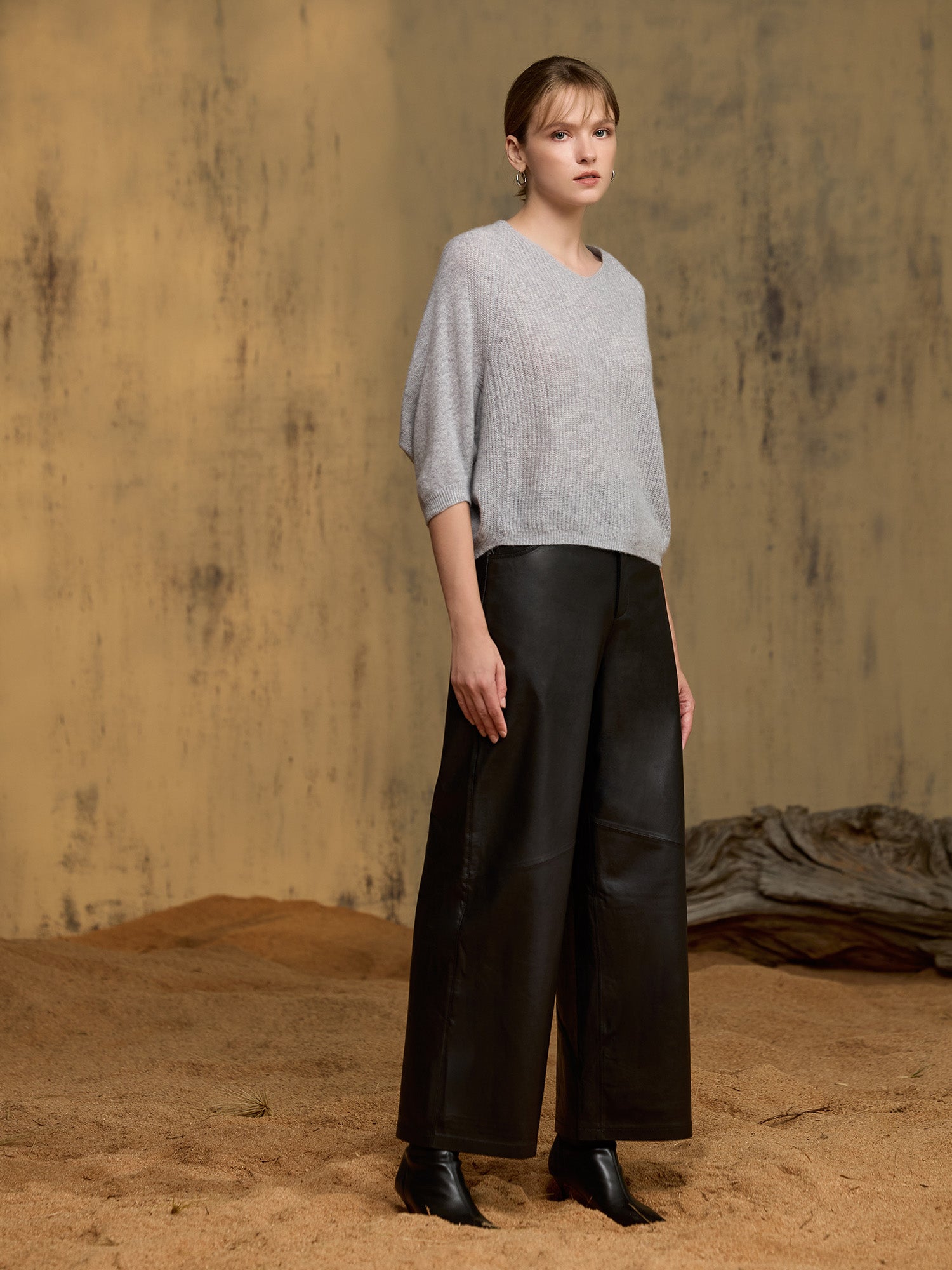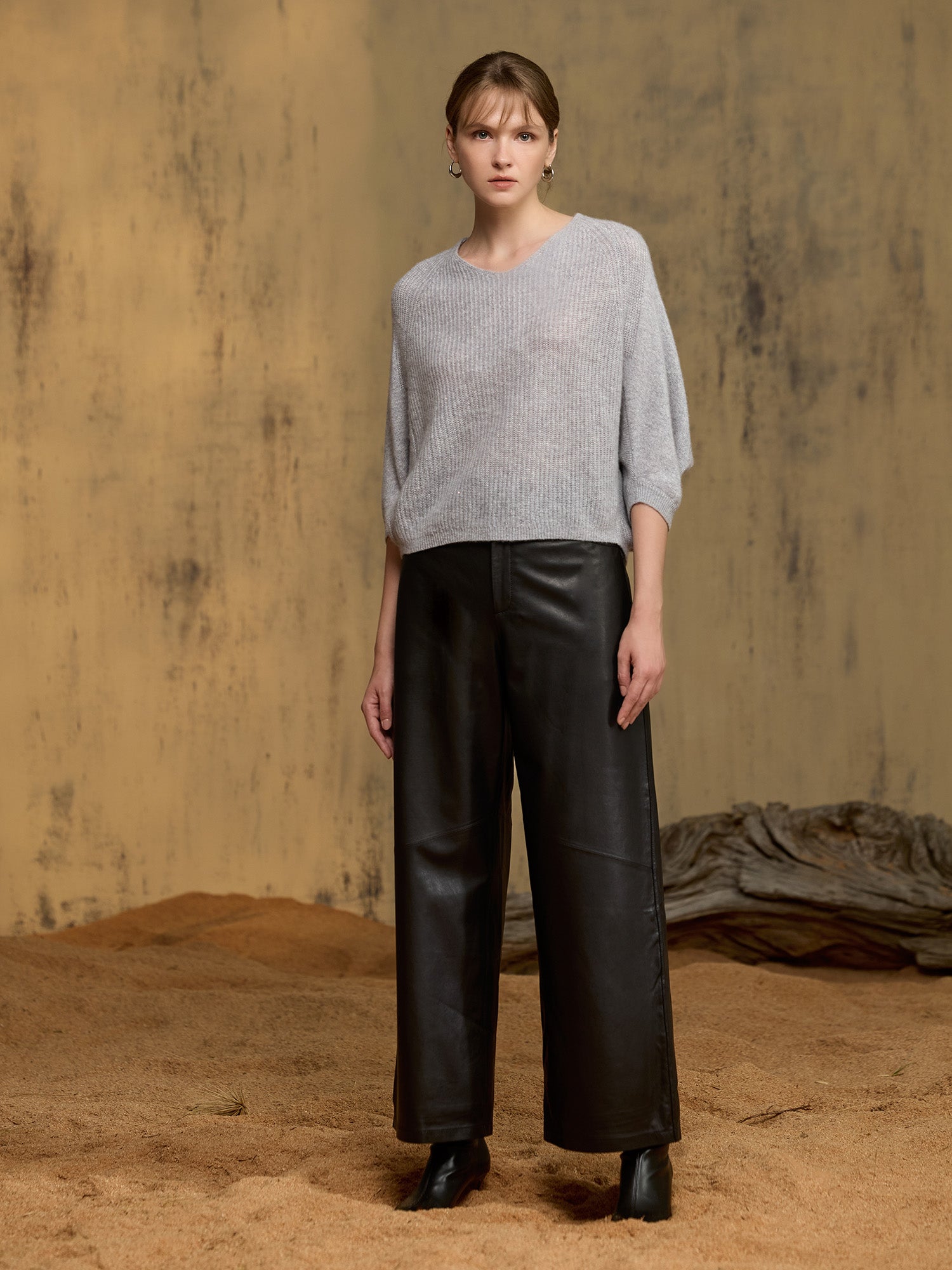 *寬鬆V領針織上衣,落肩搭配七分微寬袖修飾手臂線條,營造纖細感;下擺與袖口以羅紋收邊微微收合,使整體不顯鬆垮,展現休閒品味。