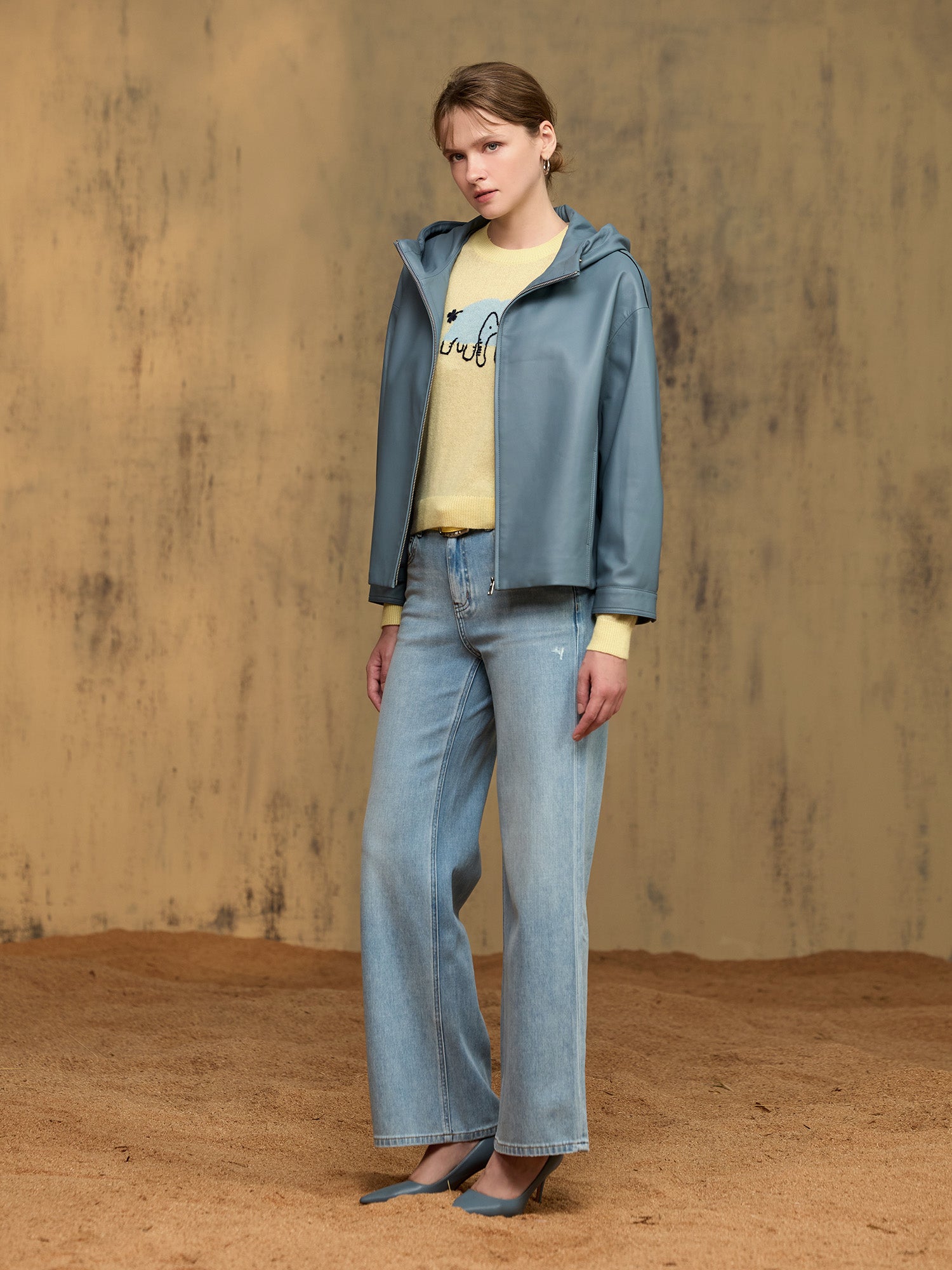 牛仔布料製作時,會因水洗加工設計使布料有獨特的刷色,故每件刷色位置/深淺有些許不同。
