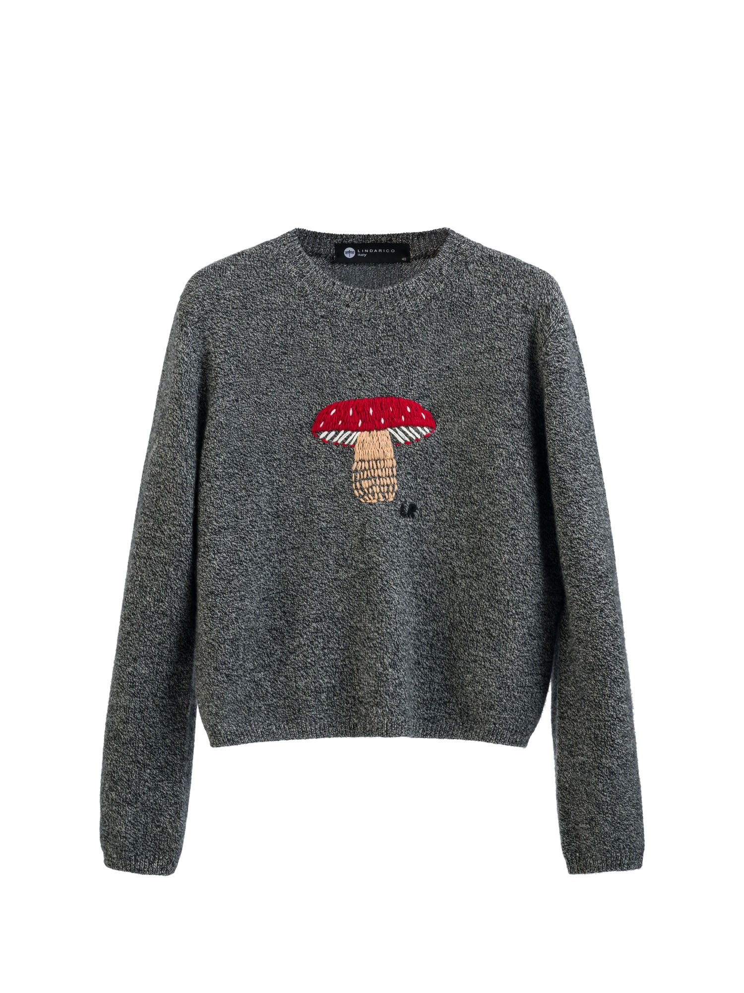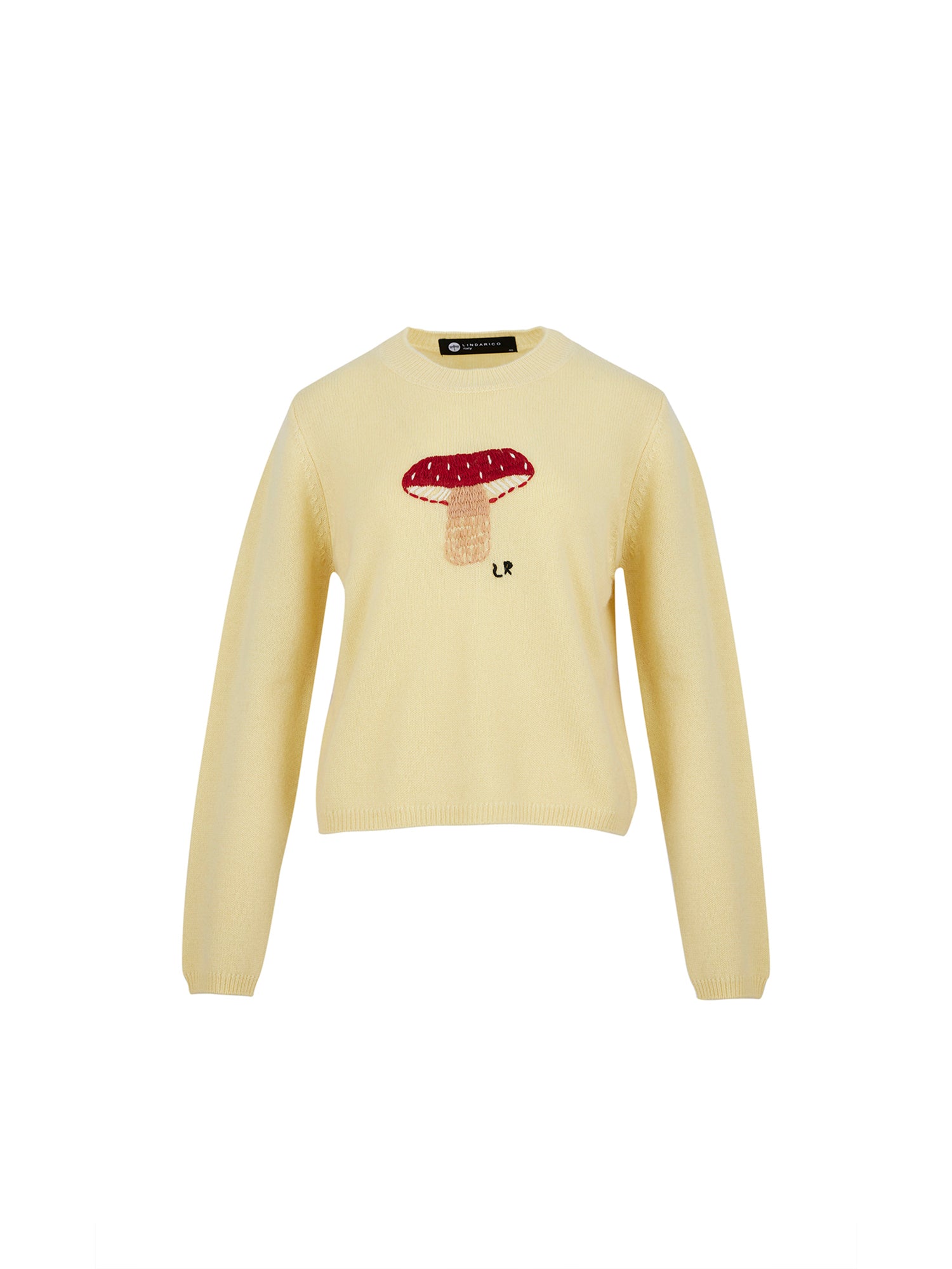 *修身圓領針織上衣,胸口以立體蘑菇刺繡點綴,手繪線條感與細節層次,十分俏皮不失質感,展現趣味且減齡的風格。