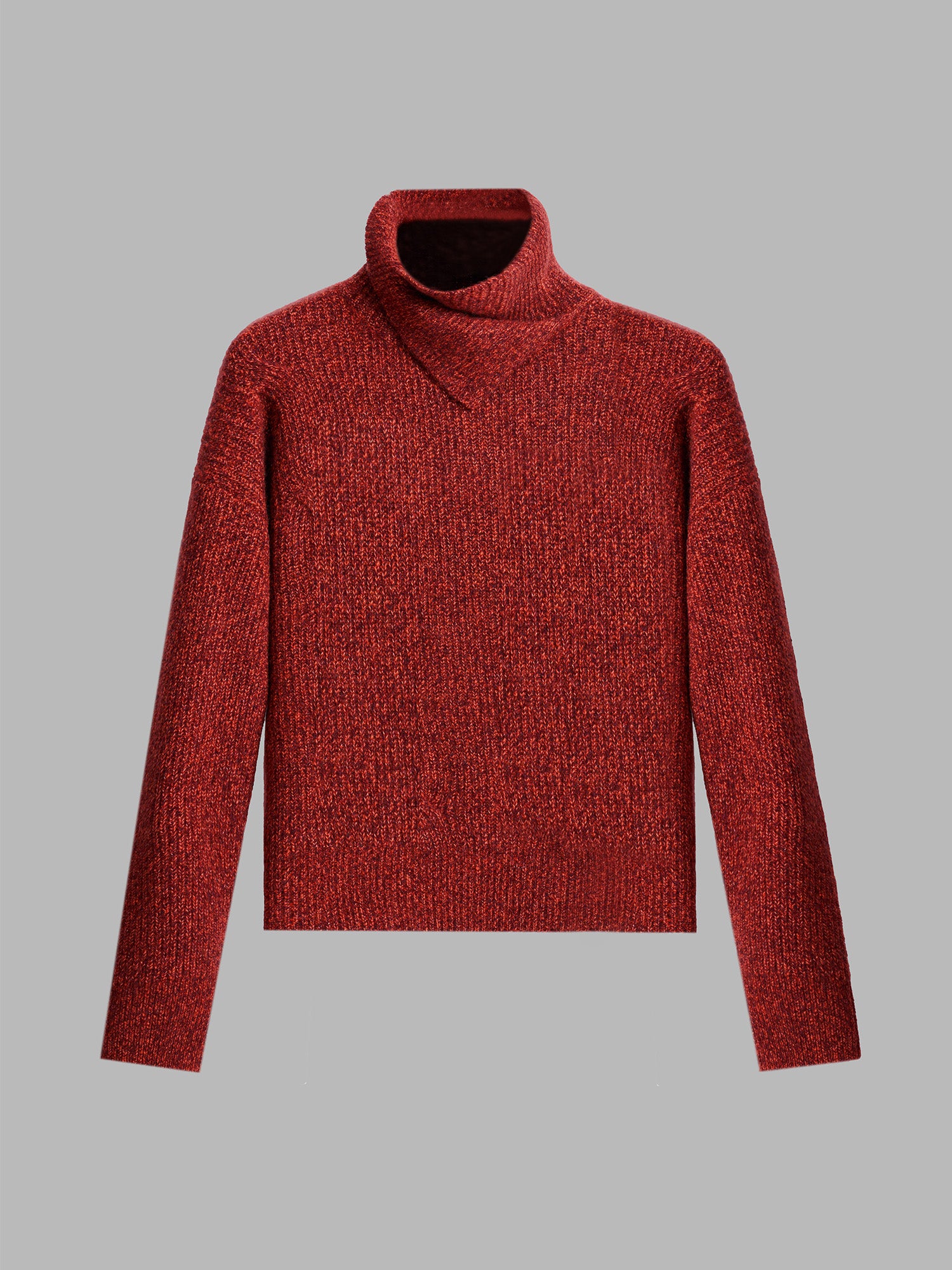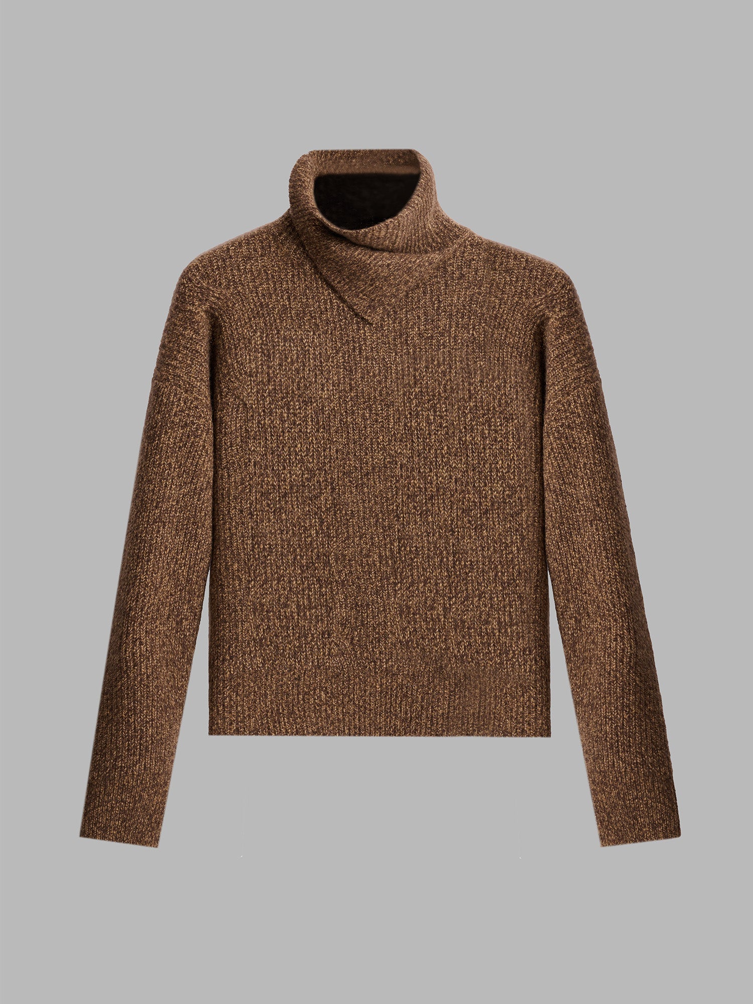 *特色斜接高領,保暖同時具有造型美感;微落肩與略寬版剪裁,營造輕鬆不拘的線條比例,運用混色針織紋理,低調中帶有層次光感,具有質感。
