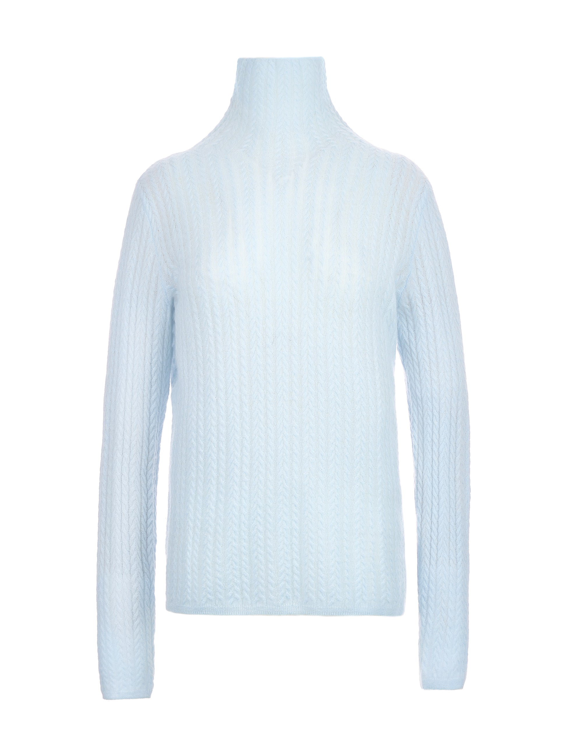 *鬆軟高領長袖針織衫,立體倒V形麻花織紋十分精緻,屬於貼身但不緊繃的彈性針織,單穿顯優雅、作為內搭亦能替造型質感加分。