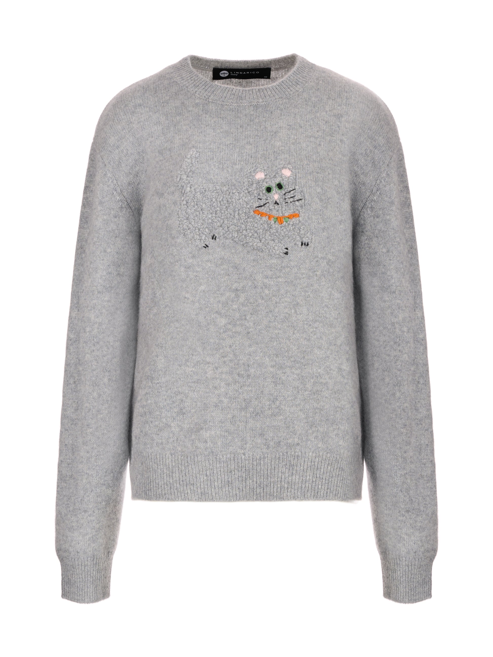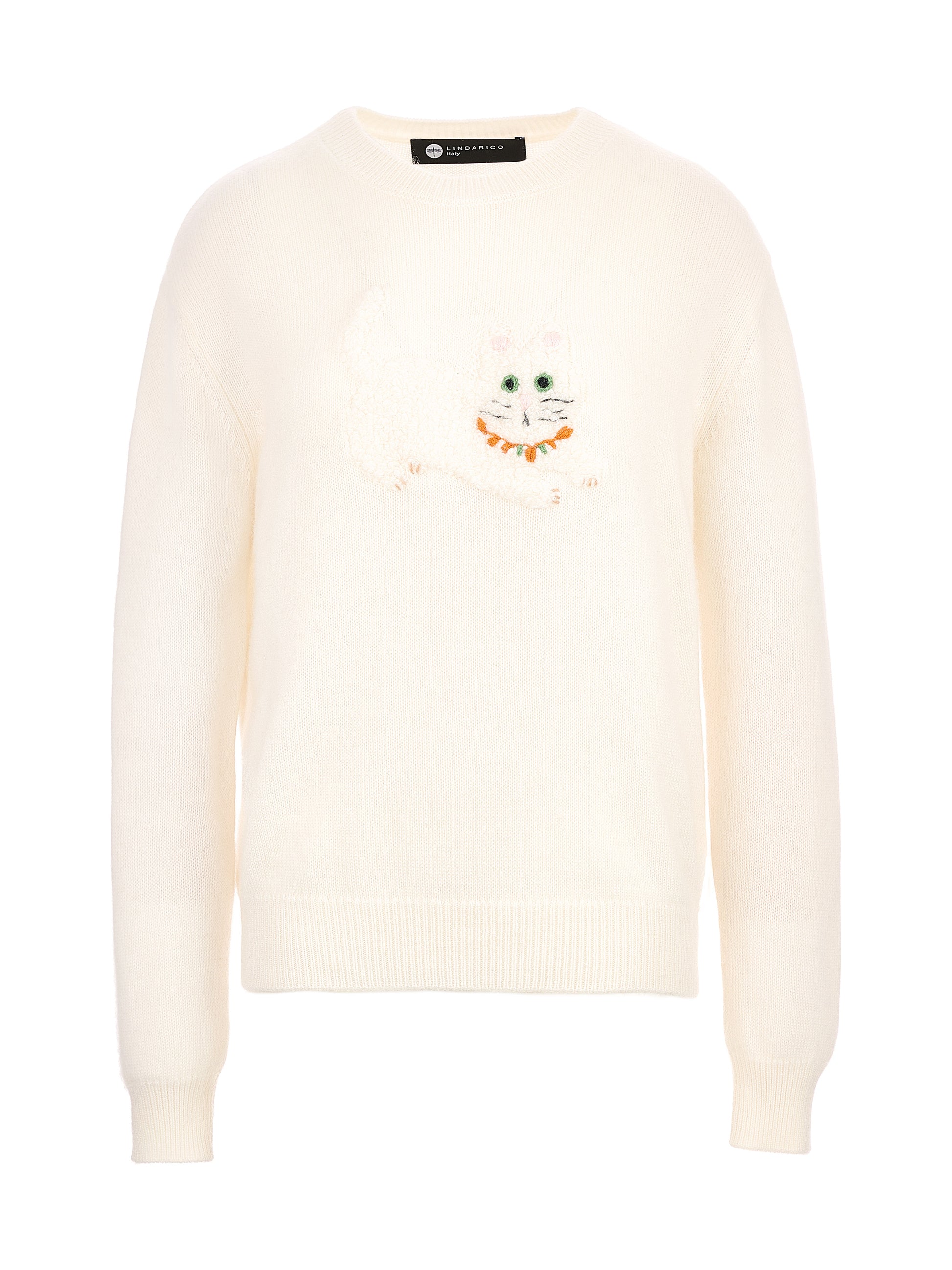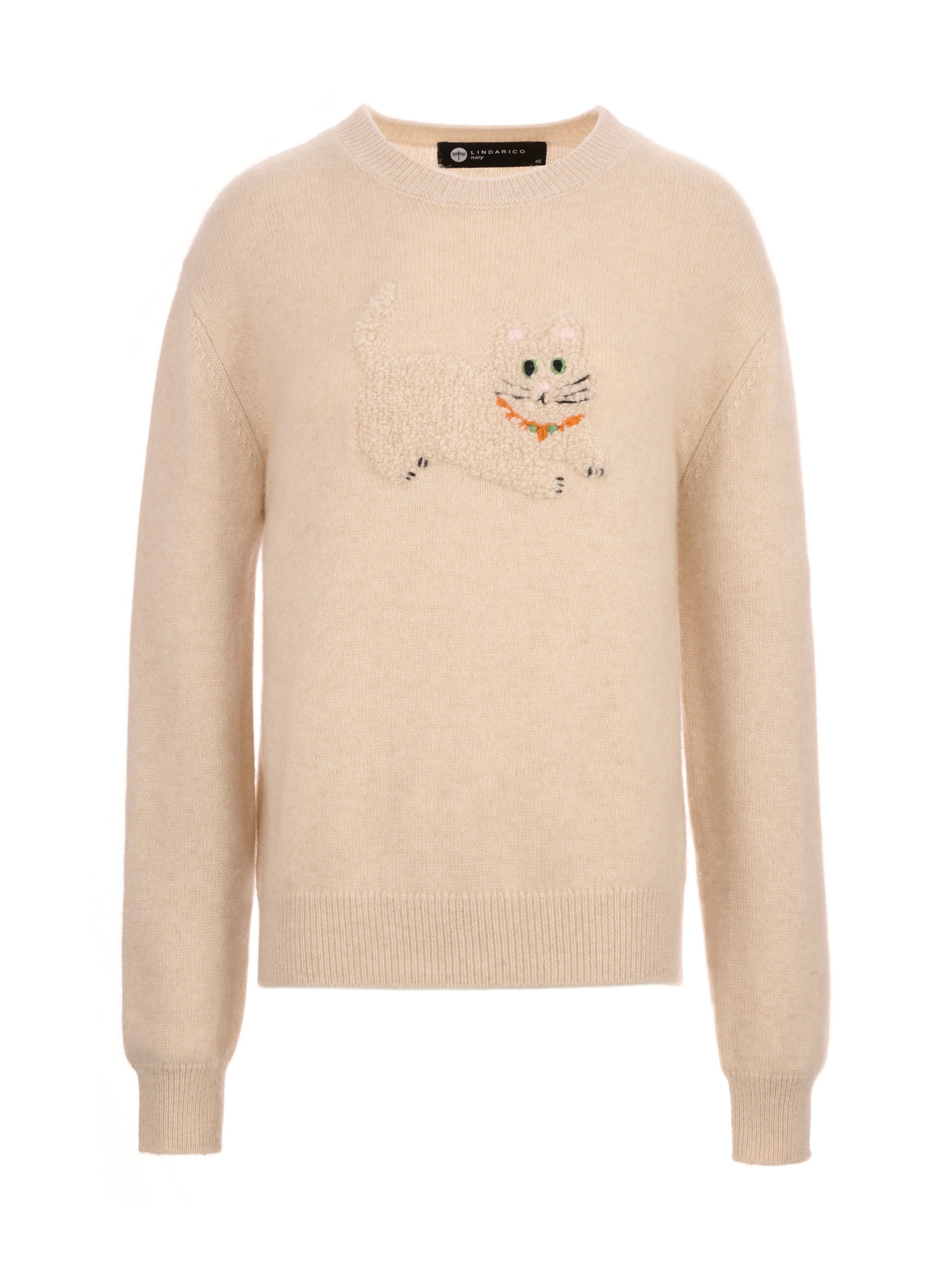 *修身版型針織上衣,胸前以立體毛絨感貓咪刺繡,呈現手工般的溫暖感受,為素色羊絨增添俏皮亮點。