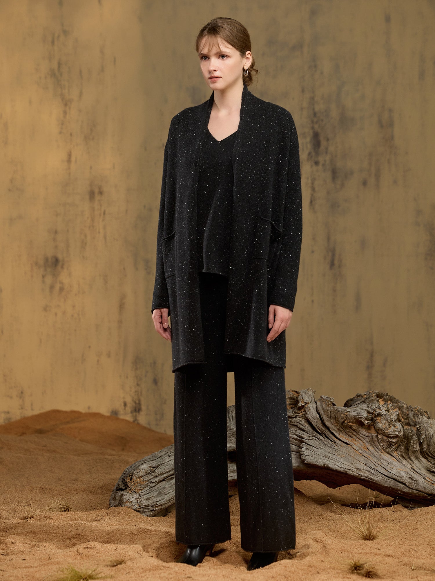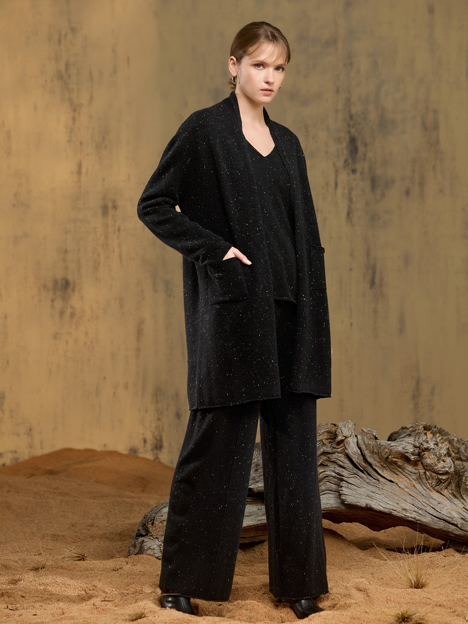 *長版無扣針織外套,垂墜線條自然流暢,隨性而優雅,混色小點編織紋理,增添細膩層次感,低調不單調。兩側貼袋實用方便,兼具休閒與造型感。