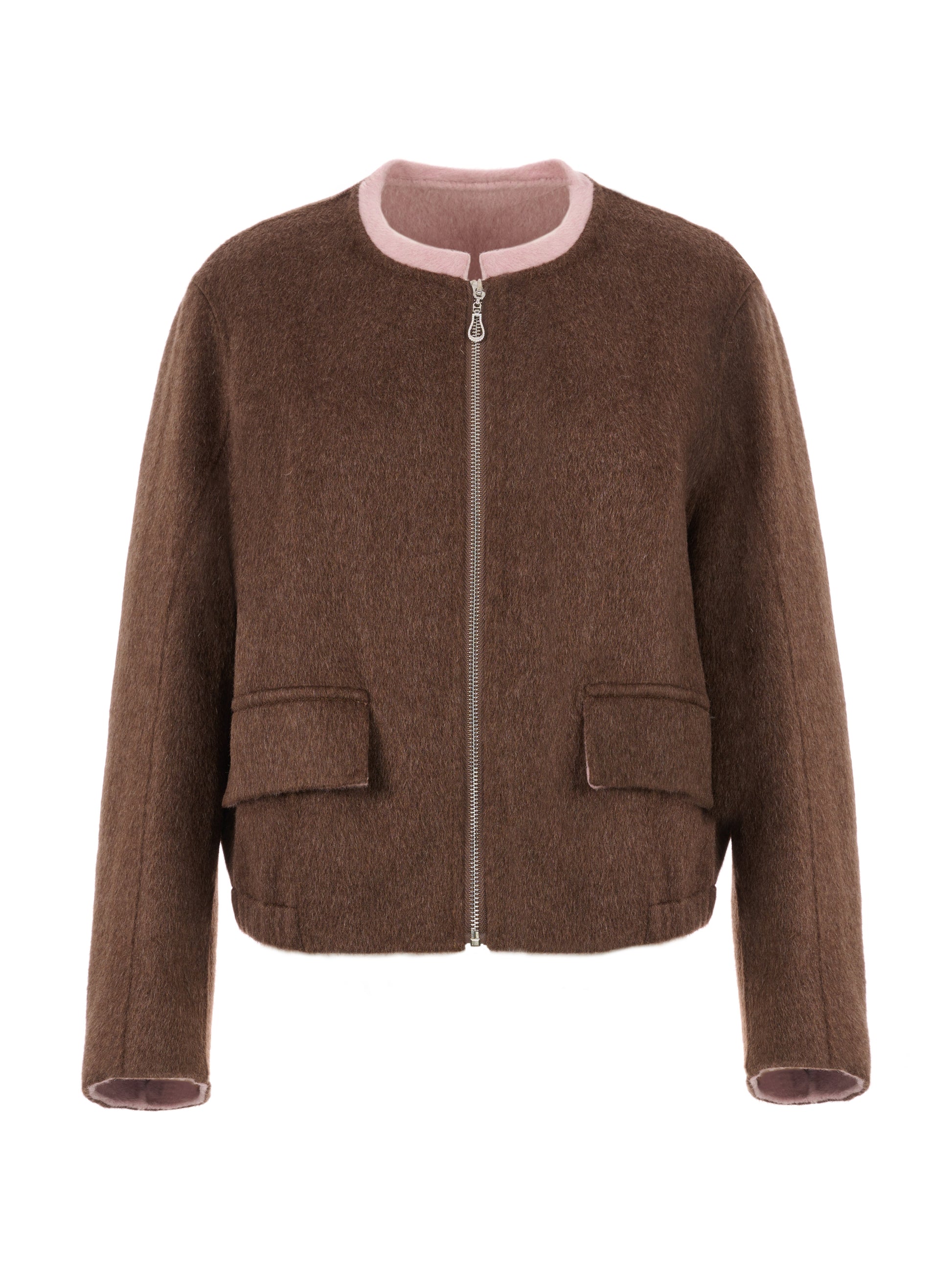 *雙色領口為外套增加變化度,低調卻具有識別度。下襬以 鬆緊收邊呈現,穿著時自然收住輪廓,讓短版外套更加修身俐落。