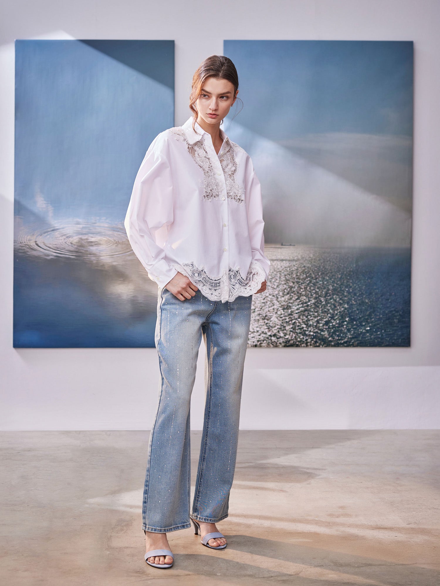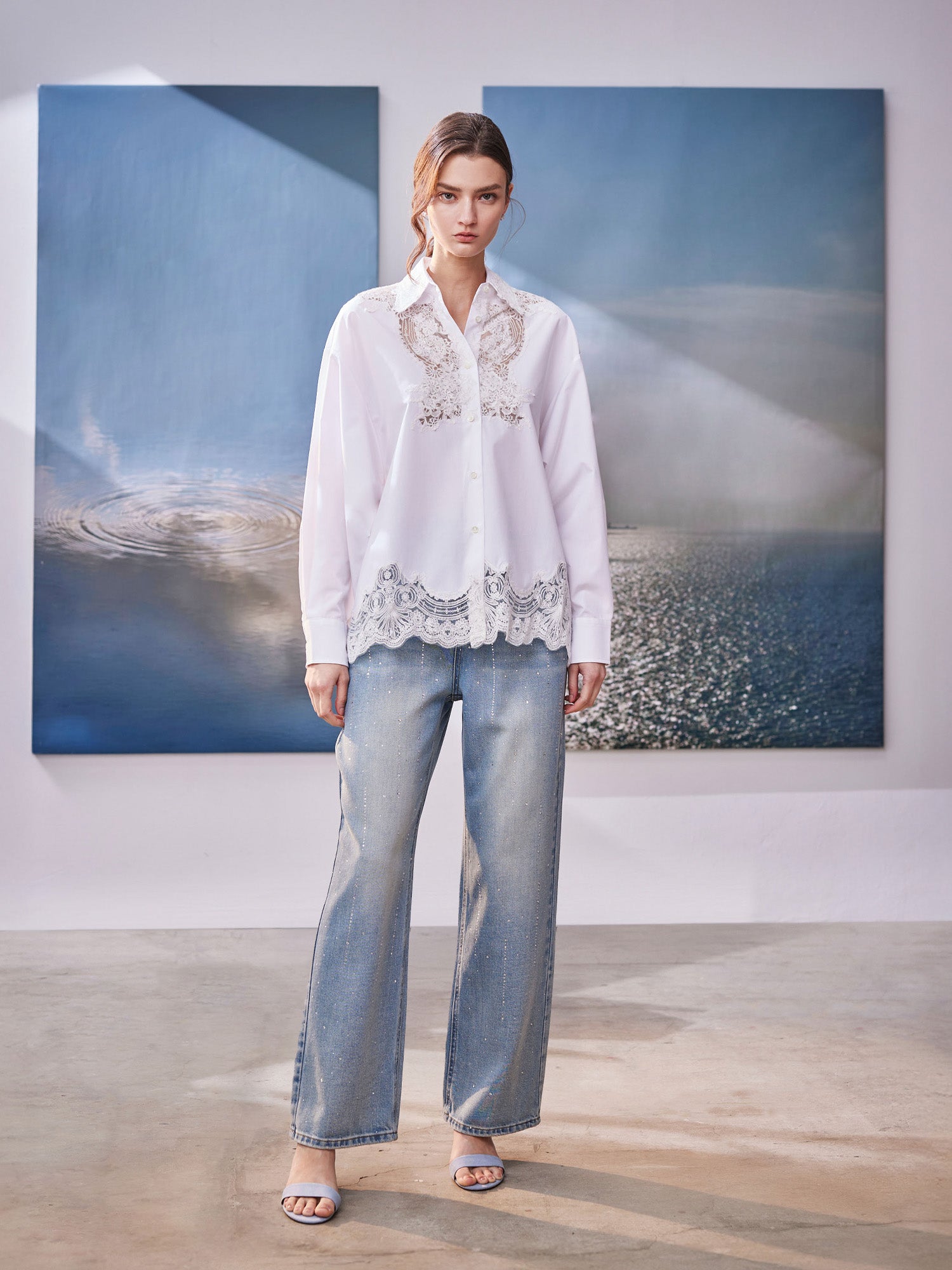 *寬鬆直身蕾絲襯衫,前片透膚蕾絲拼接,由胸口延伸至下襬,衣襬同樣點綴不規則蕾絲花邊,工藝精緻,細節豐富,展現浪漫氣息。