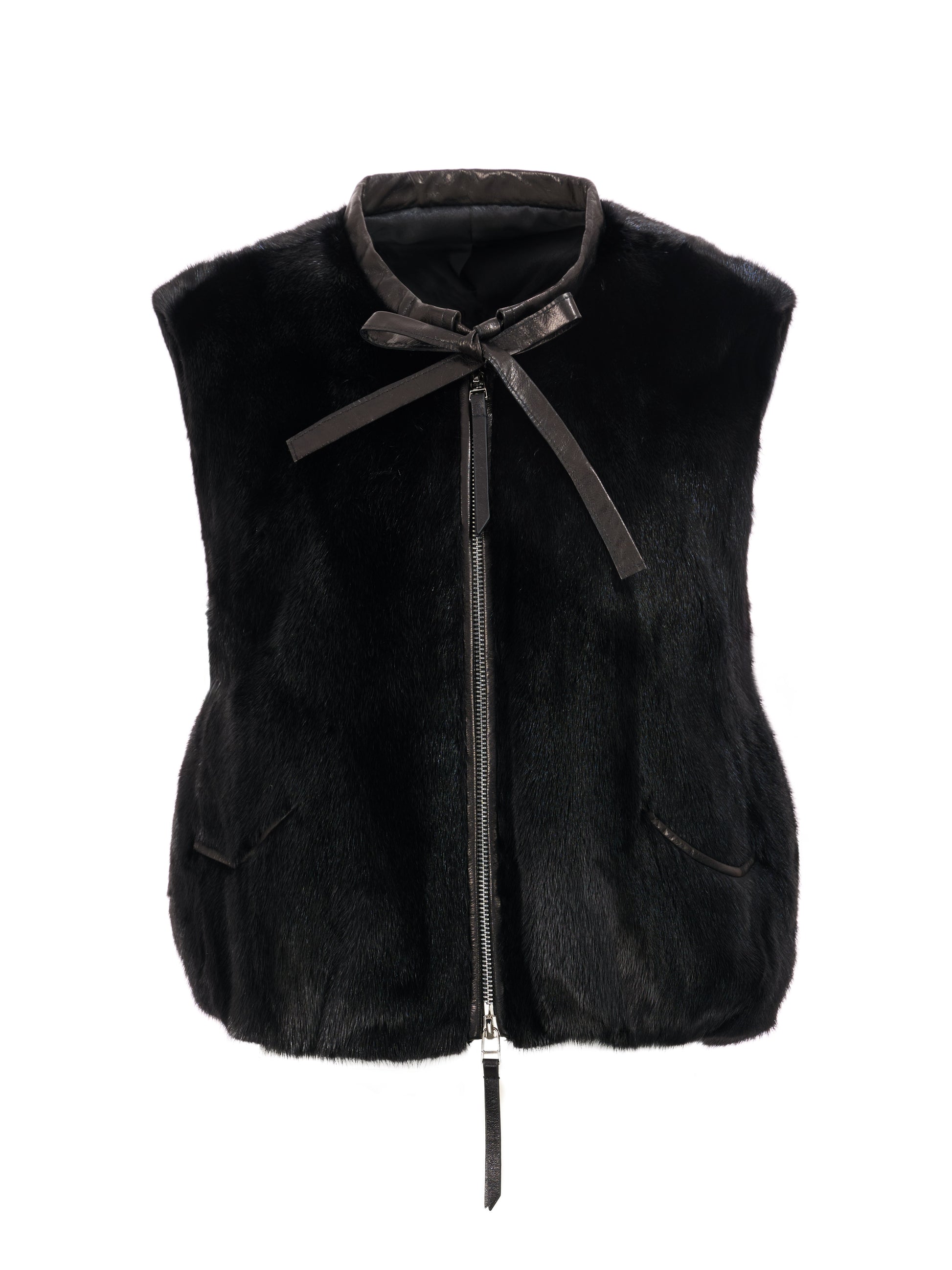 *輕巧貂毛拉鍊背心,領口以小羊皮蝴蝶綁帶點綴,柔軟皮革與水貂毛形成異材質對比,是具識別度的設計亮點。