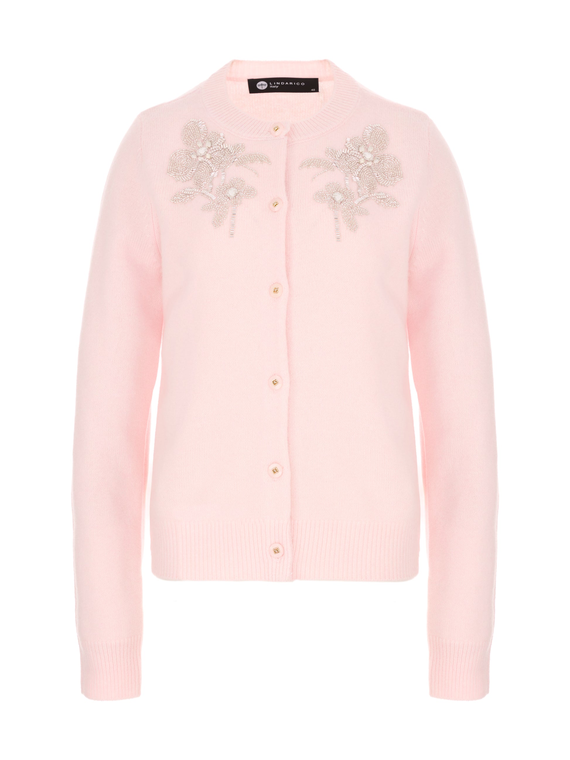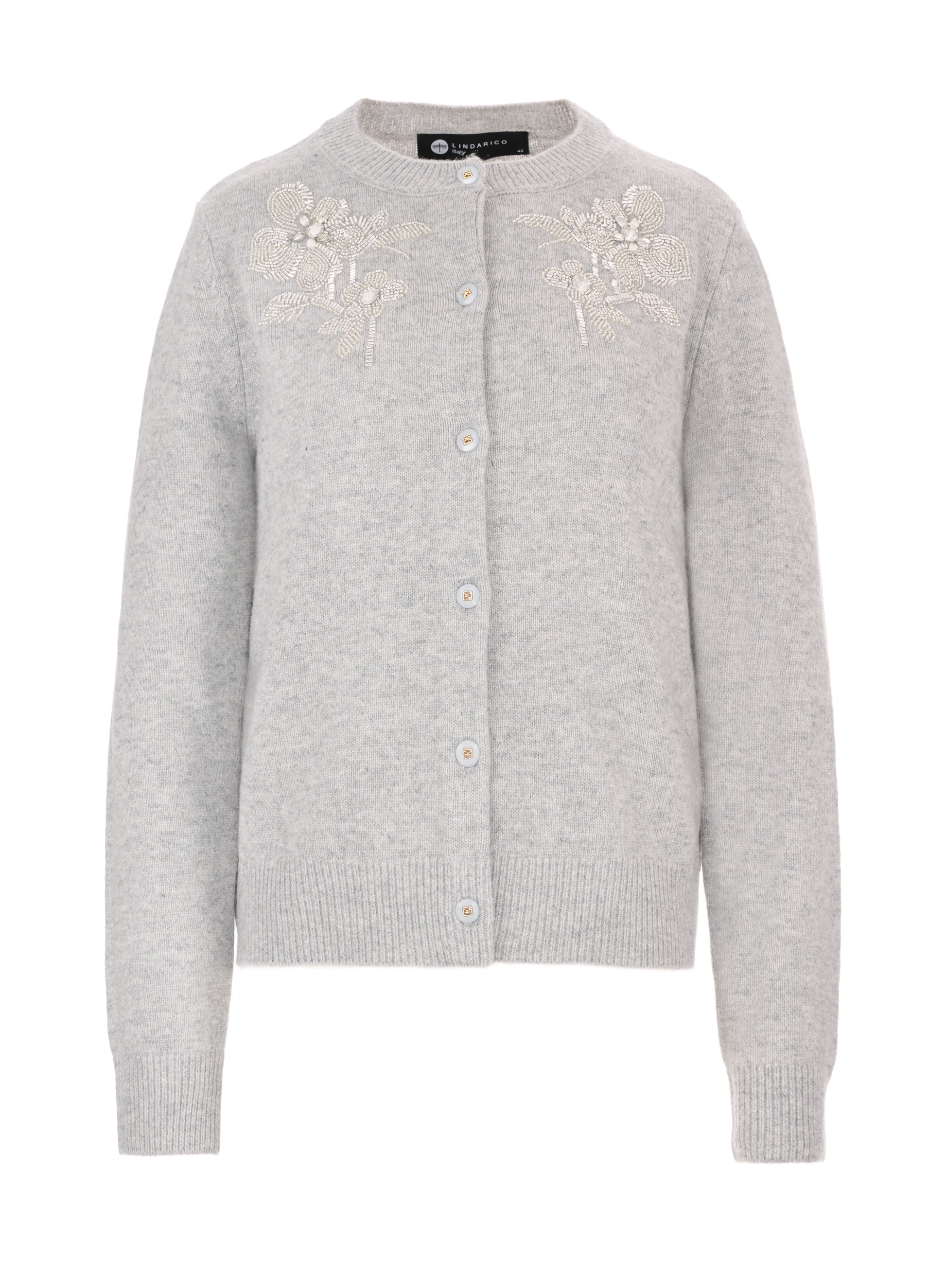*胸前以立體刺繡花卉點綴,結合細緻珠飾與線繡工法,層次集中於上身視覺位置,為素雅針織注入精緻而柔和的女性氣質。