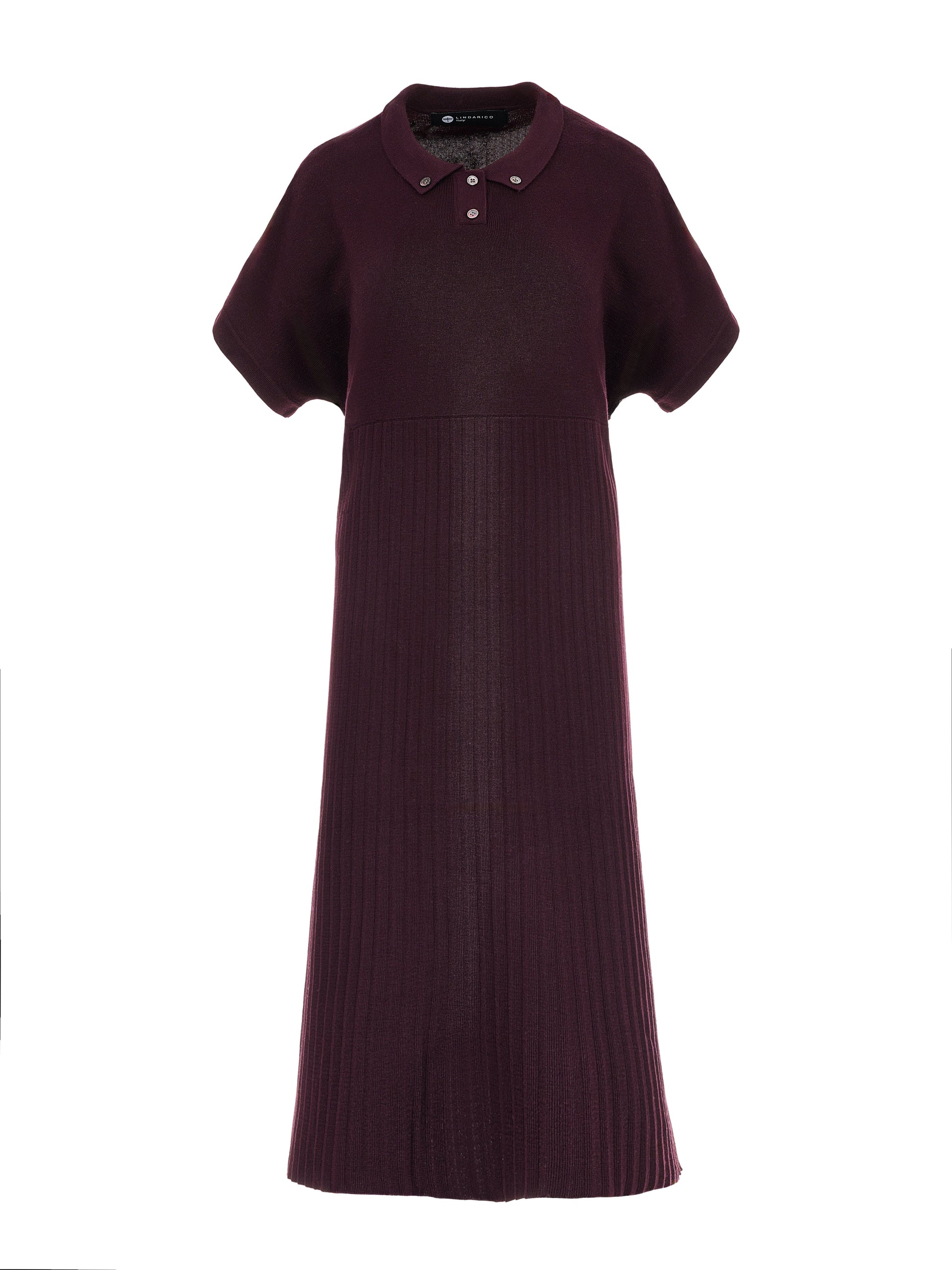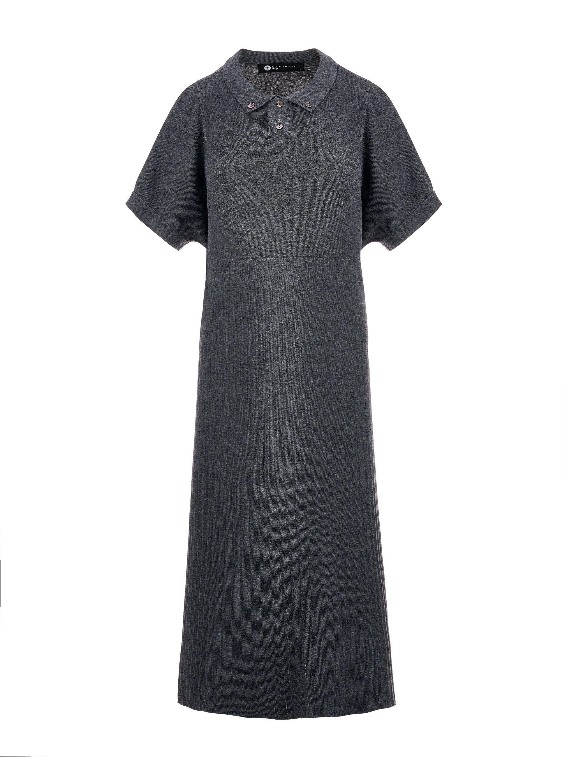 *寬鬆不拘束的針織洋裝版型,微落肩短袖搭配簡潔小翻領與釦飾;下半部以細直紋拼接與自然垂墜的細密針織呈現修長線條,穿起來輕鬆、清爽又低調耐看。