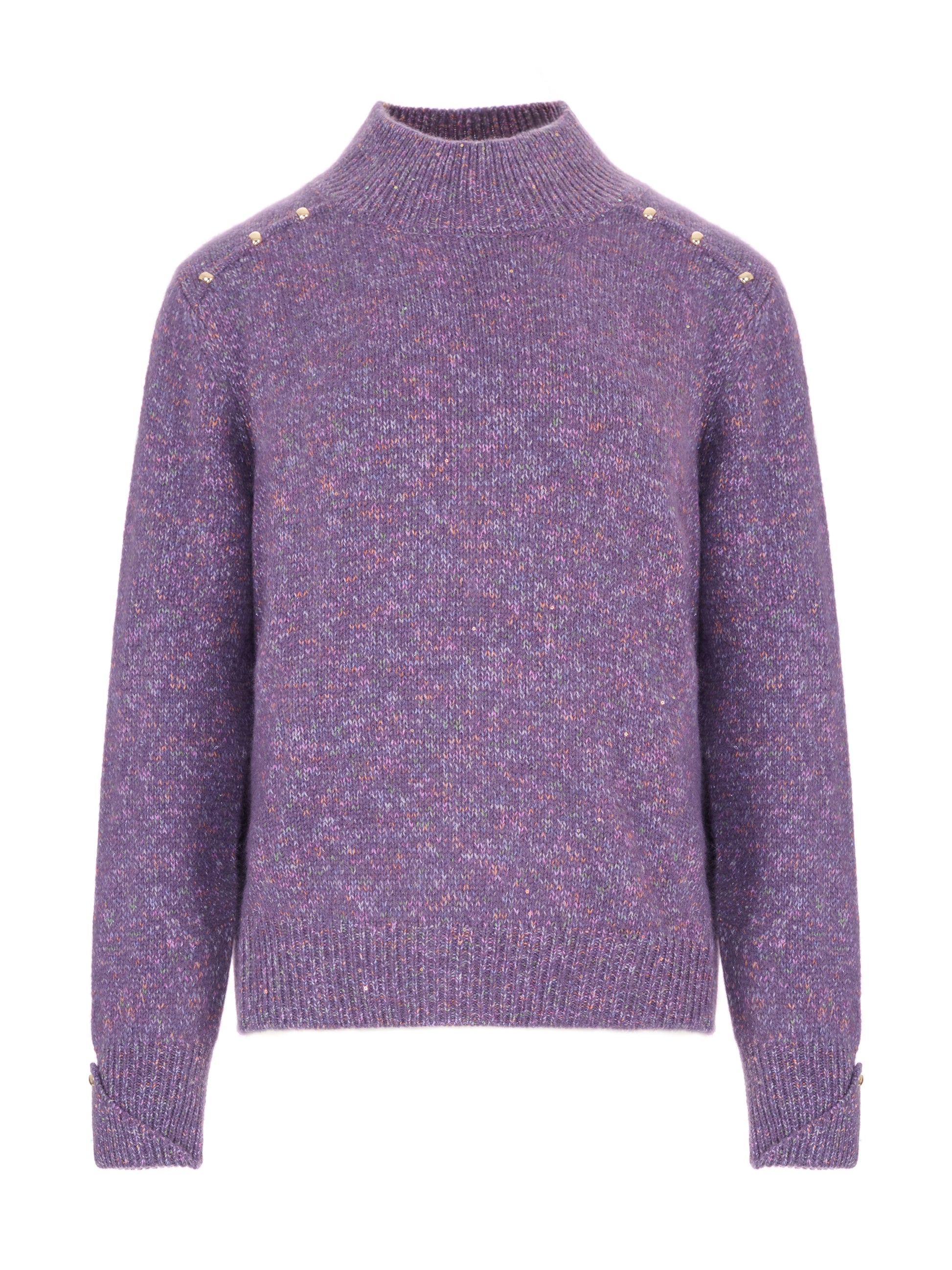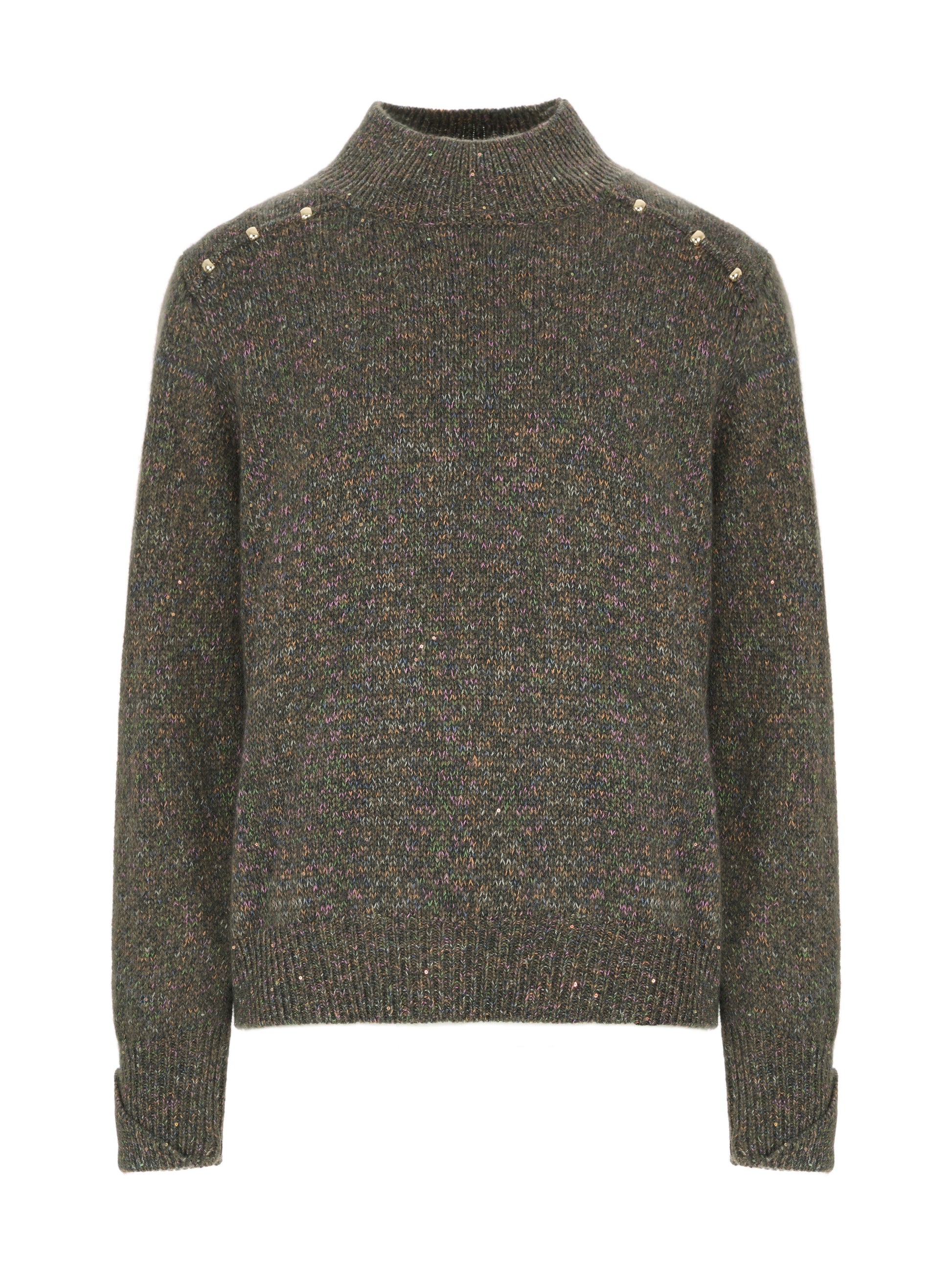 *半高領針織輪廓,肩線以拉格蘭結構延伸,線條柔和,穿著活動度高。肩部點綴金屬珠飾細節,沿肩線排列,為簡約針織注入低調光澤層次,恰到好處地提升精緻度。