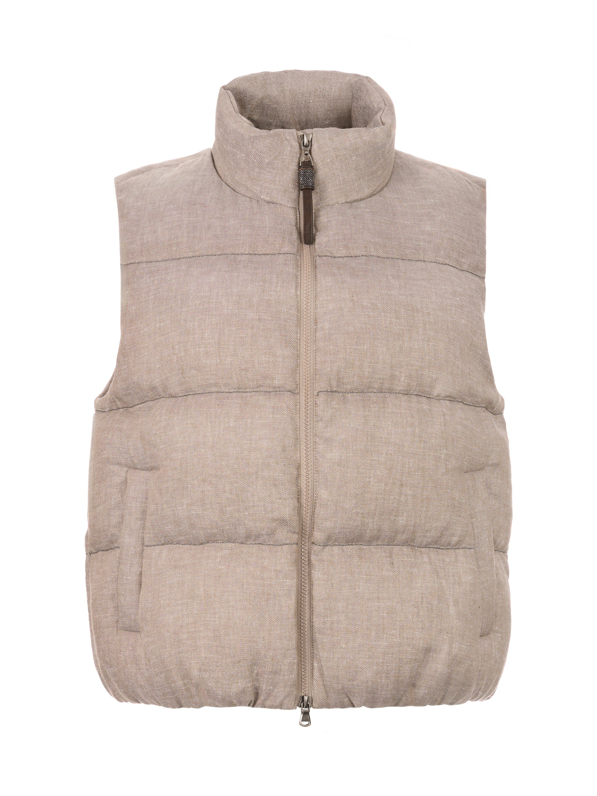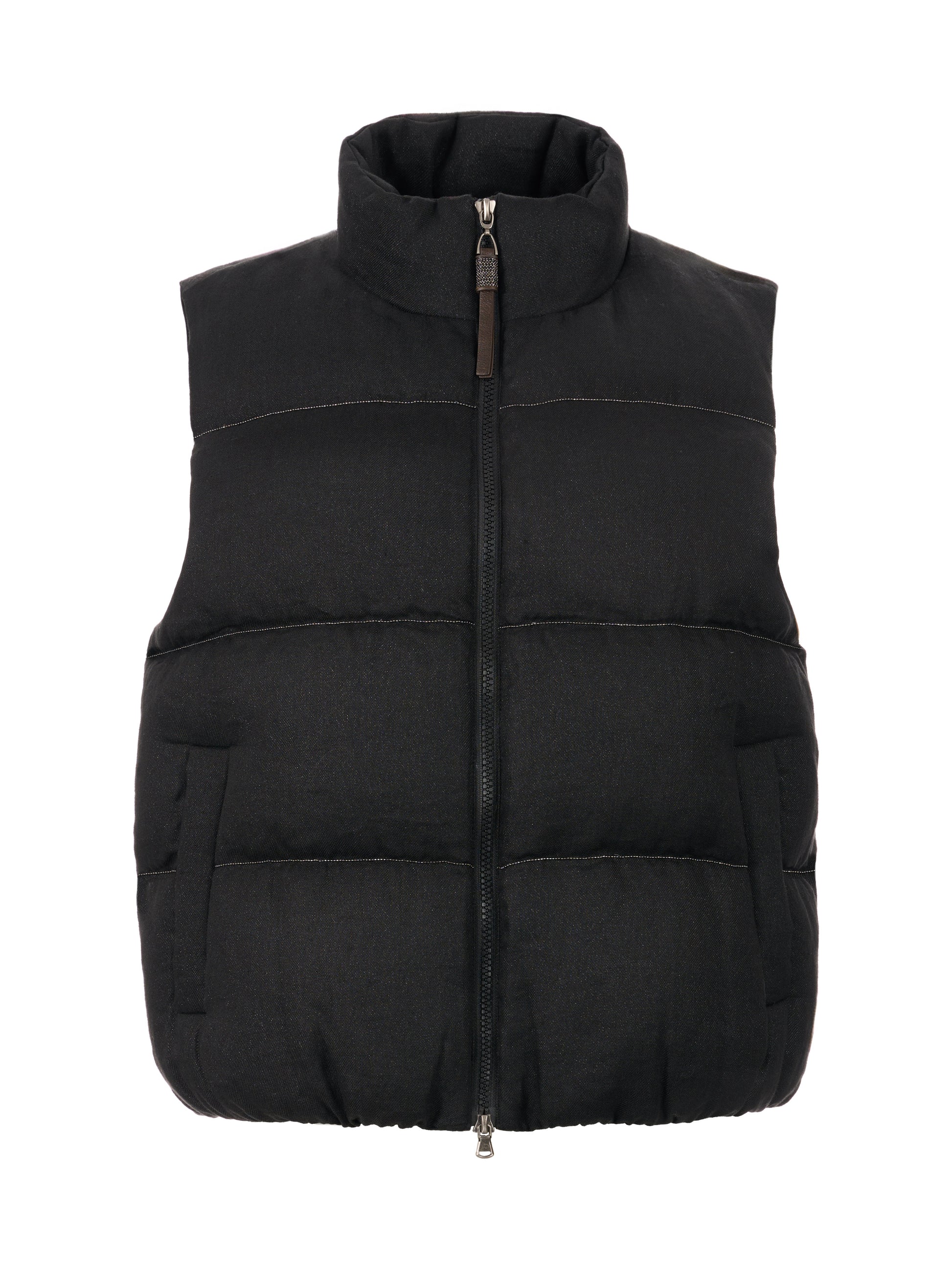 *背心剪裁俐落,不顯膨脹,立領設計可增加頸部包覆度,更加保暖;背心上的立體絎縫線加入細緻珠鏈裝飾,呼應拉鍊設計,低調點綴整體質感。